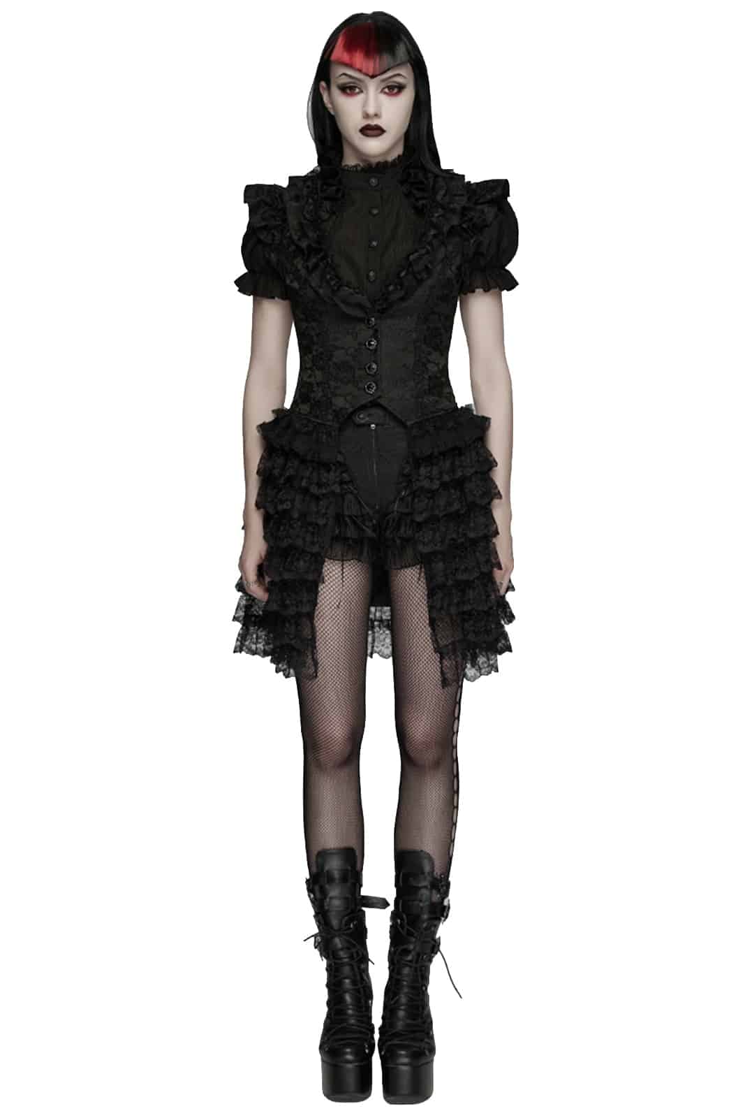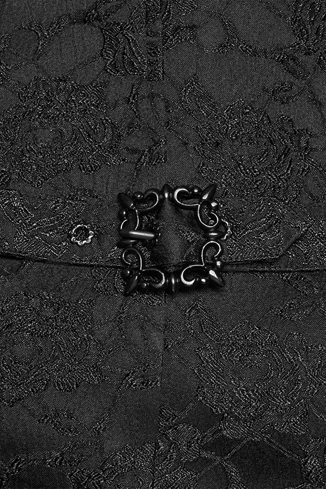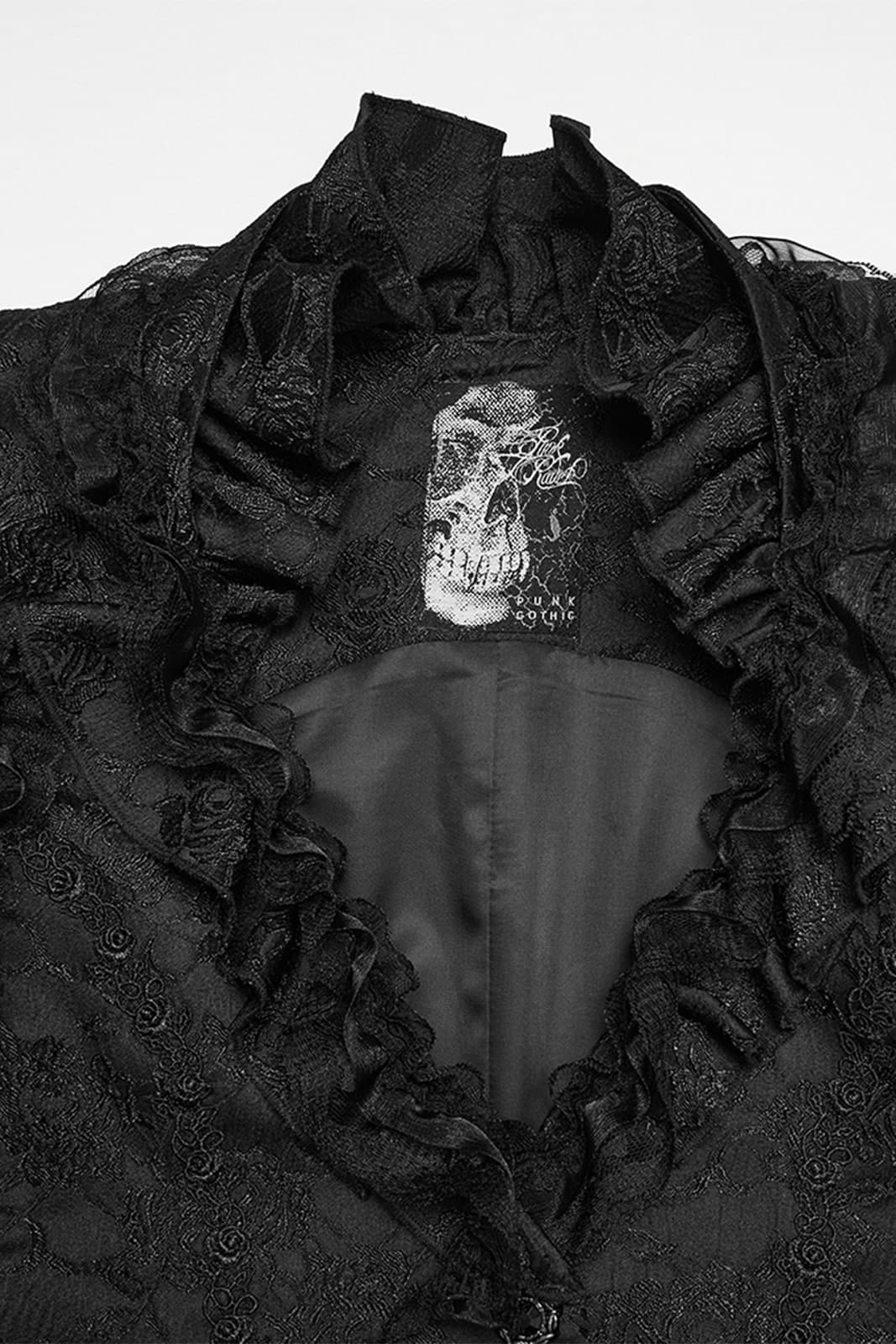 Romantisch, detailverliebt und mit dunkler Eleganz – die „Faerie Doll Vest“ vereint viktorianische Ästhetik mit moderner Gothic Attitude. Strukturierter Jacquard trifft auf verspielte Rüschen und sorgt für einen außergewöhnlichen, femininen Look mit Tiefe.