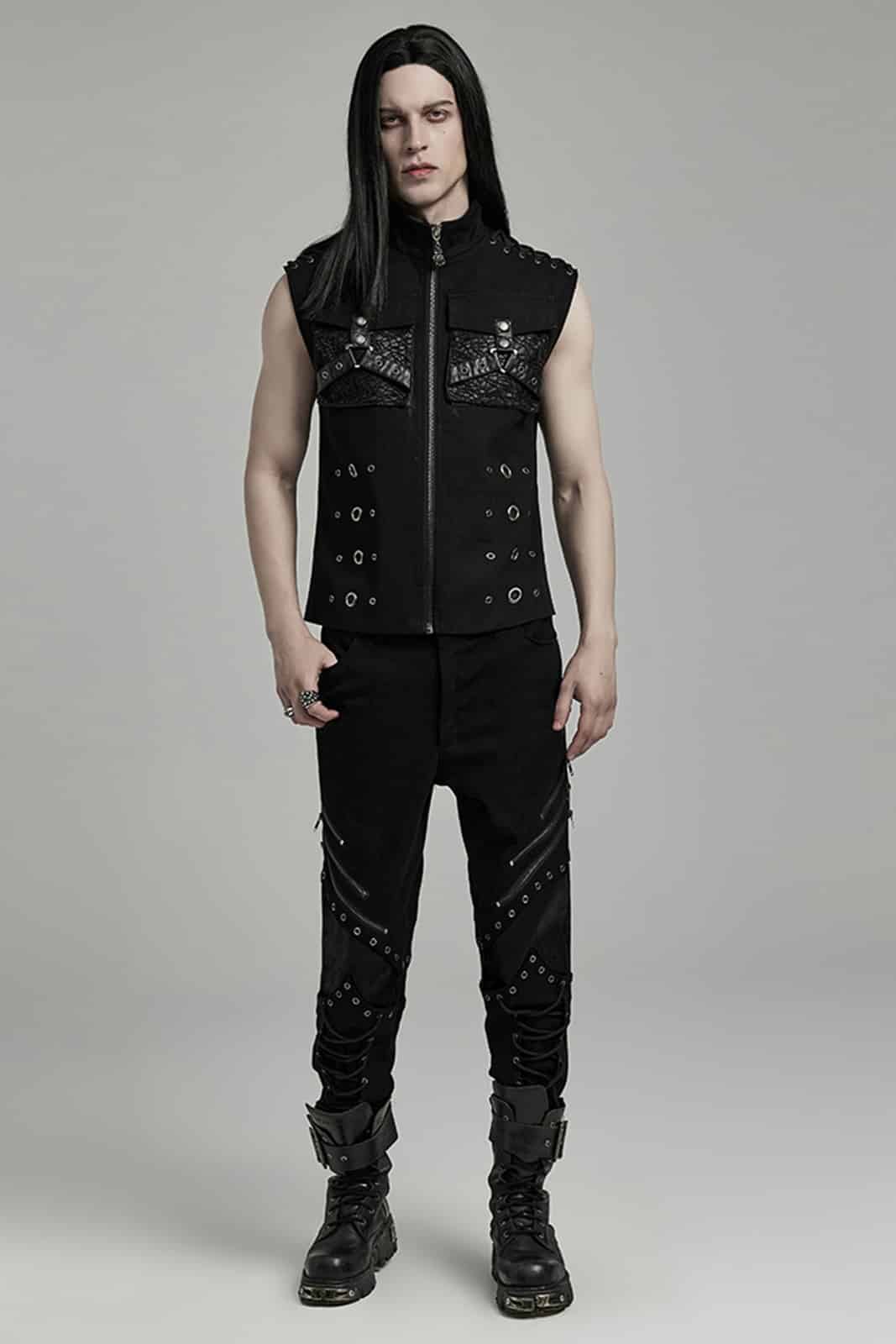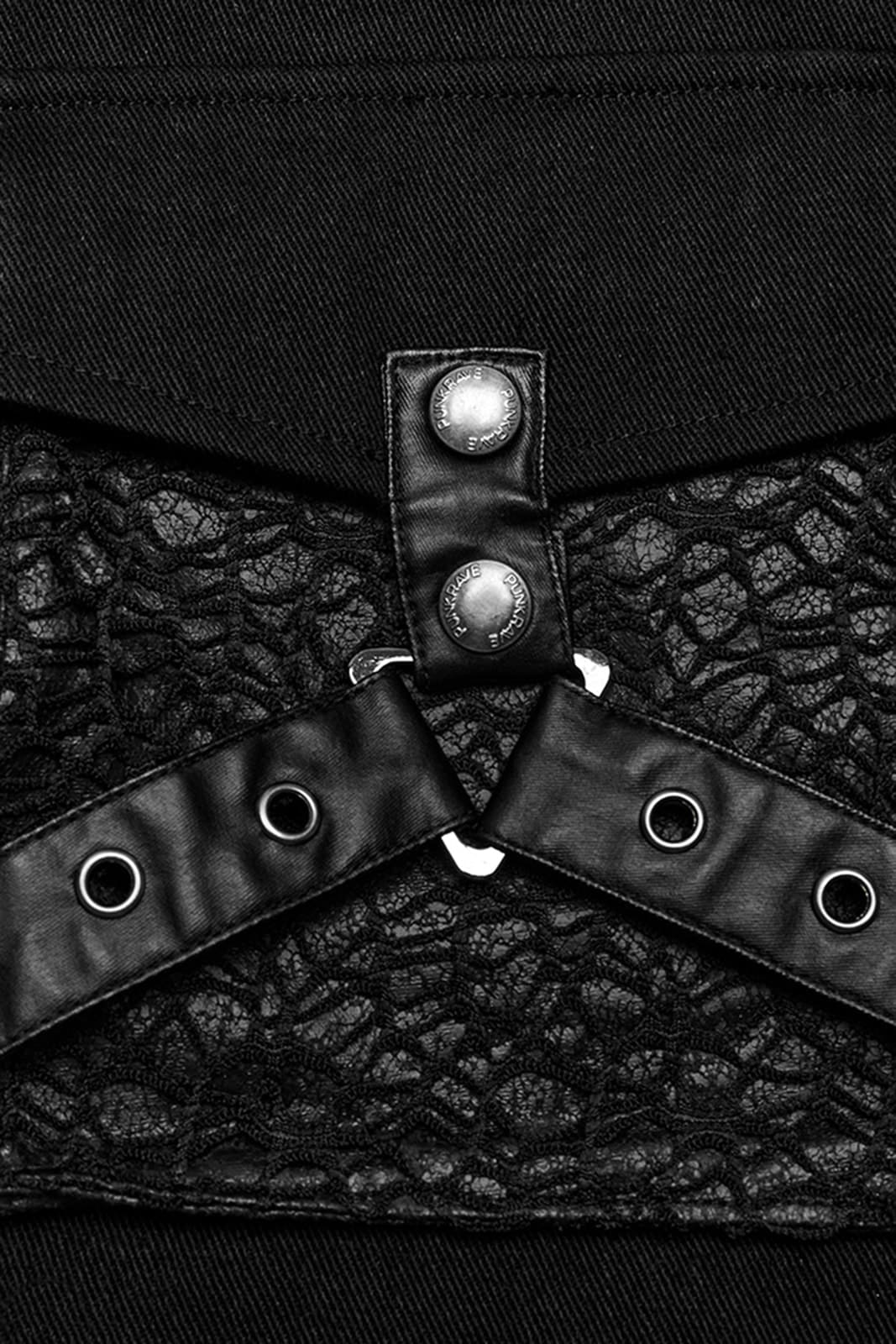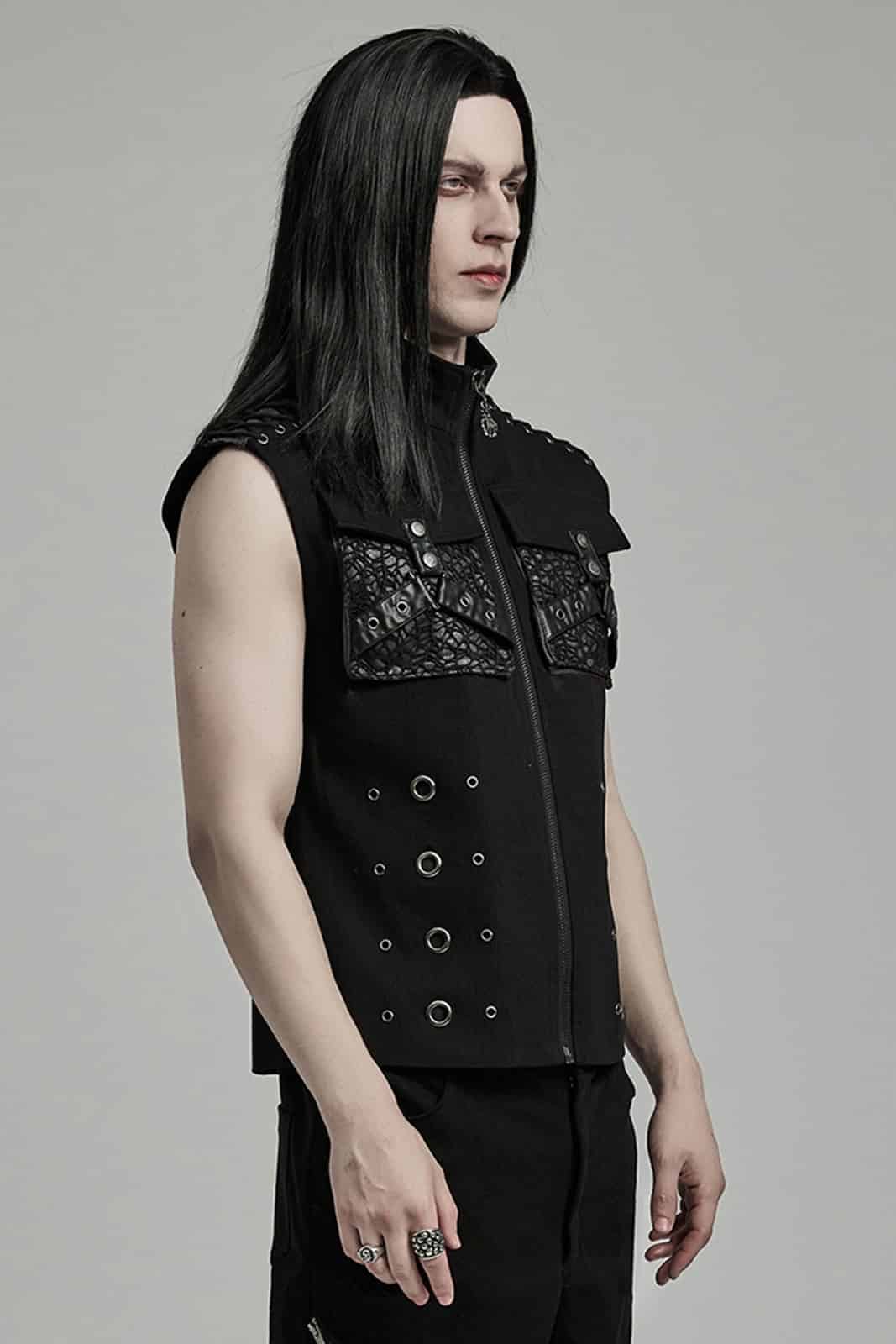 Dark-Punk-Weste mit hohem Kragen und Reißverschluss, schwarzen Akzenttaschen, Ösen und geschnürten Schulterdetails. Tailliert geschnitten. Vorn mit zwei Brusttaschen mit Gurtdetail und schwarzem, strukturiertem Kunstleder-Akzent. Die Schultern sind mit Ösen verziert. Mit kurzem Stehkragen.