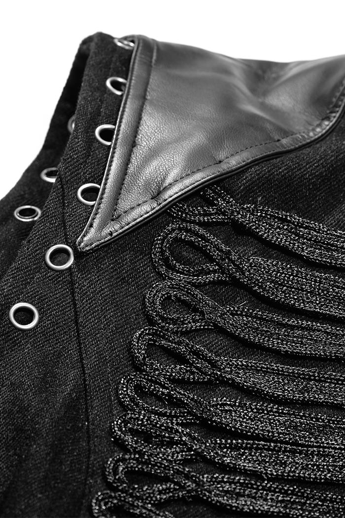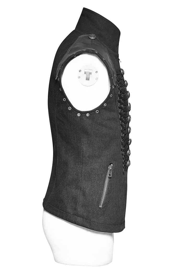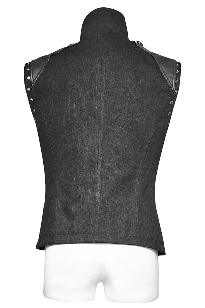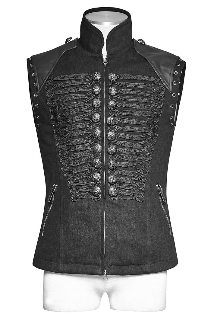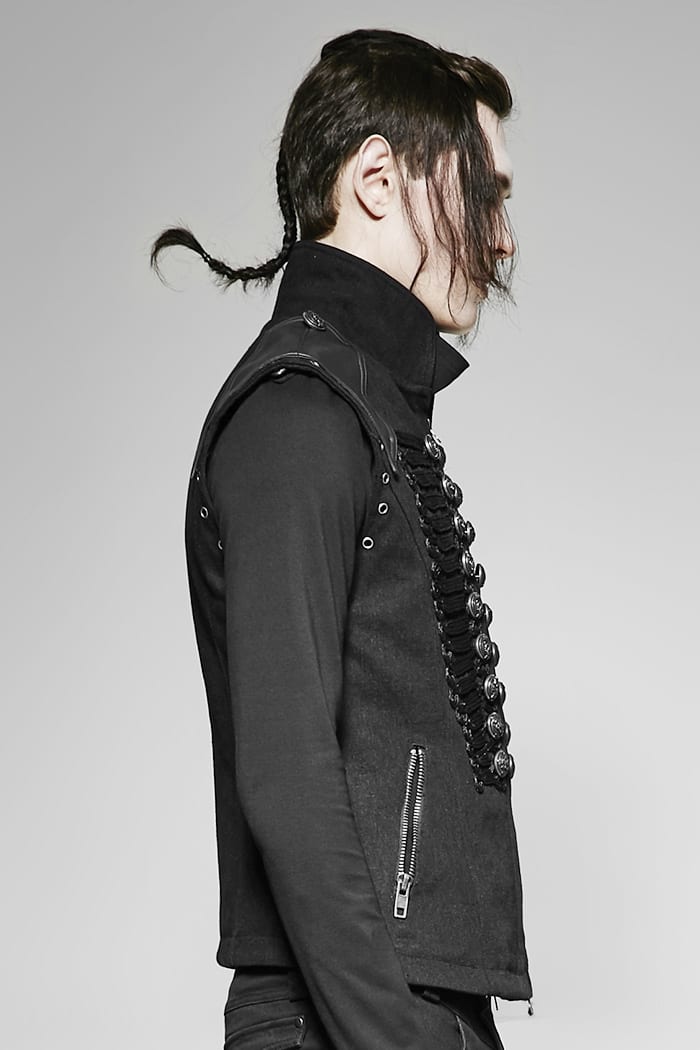 Herrenweste im Steampunk-Style aus schwerem Twill mit Frontreißverschluß, Stehkragen und Kunstlederbesatz an den Schultern. Verziert mit messingfarbenen Motivknöpfen, Ösen und Bordüren. Ausgestattet mit zwei Reißverschlußtaschen.