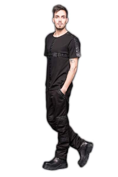 Gothic men’s trousers in a cross look with imitation leather applications in a rivet look. With this you rock the night!