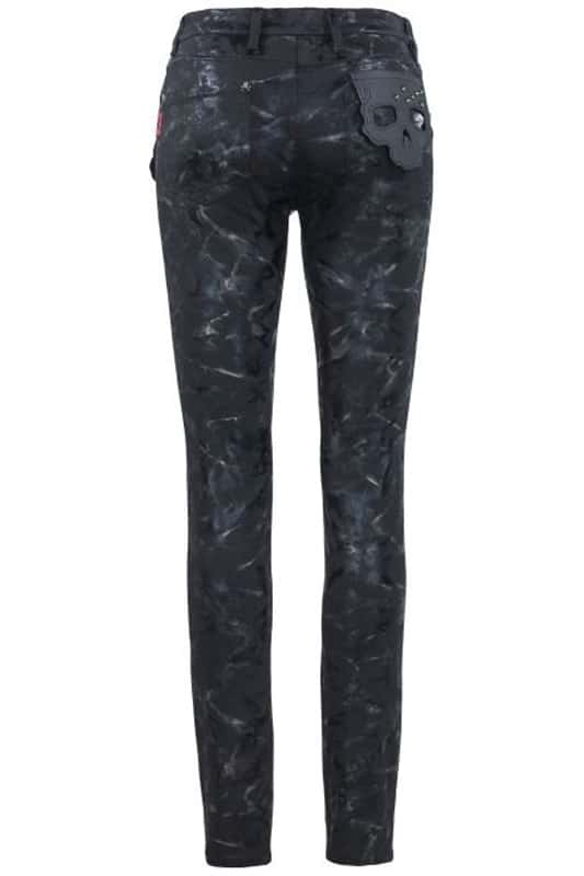 Glänzende Röhre mit Skull-Applikation für heiße Kurven. 5-Pocket Style, mit Nieten verziert.