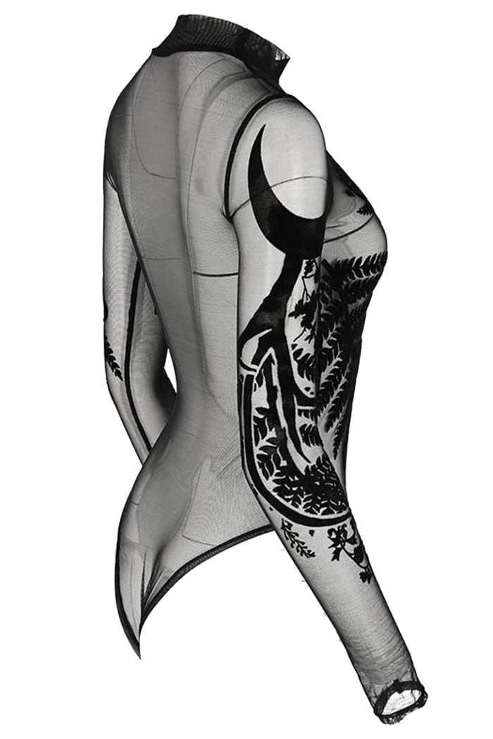 Gothic body in occult style made of the finest mesh material with a stand-up collar, flocked with fern leaves and a deer skull with horns. Long-sleeved, closes with 2 snaps at the crotch.