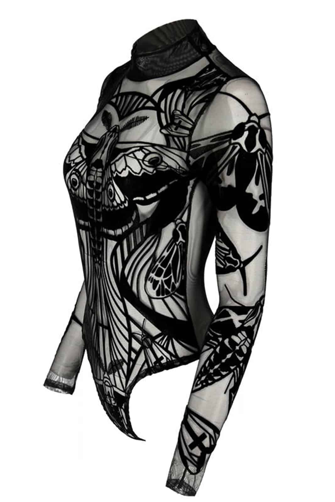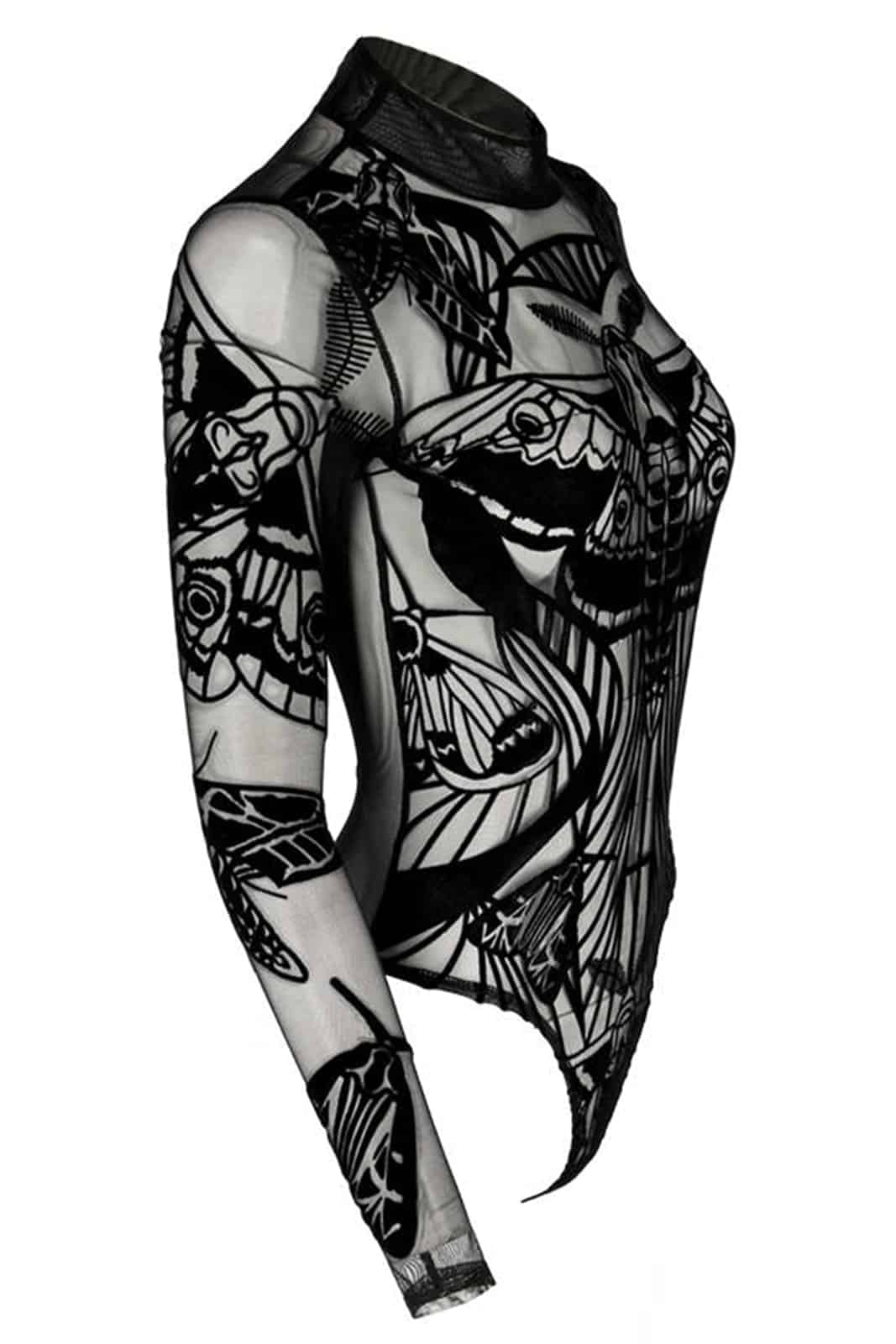 The pattern shows various gothic moths. The bows at the sides also visually slim your waist and the largest moth has been printed in such a way that it emphasizes your bust.
