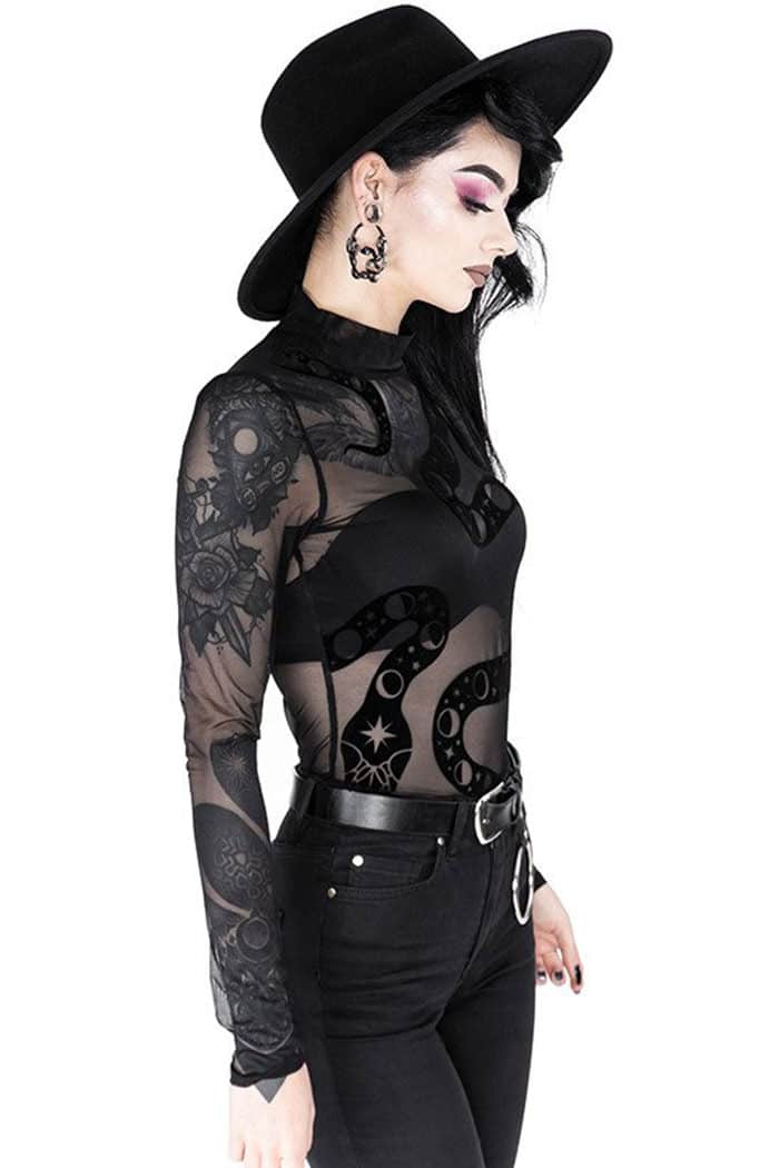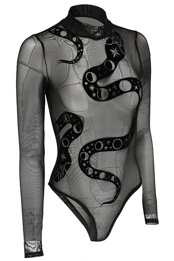 Gothic body in occult style made of the finest mesh material with a stand-up collar, flocked with a snake and phases of the moon. Long-sleeved, closes with snaps at the crotch.