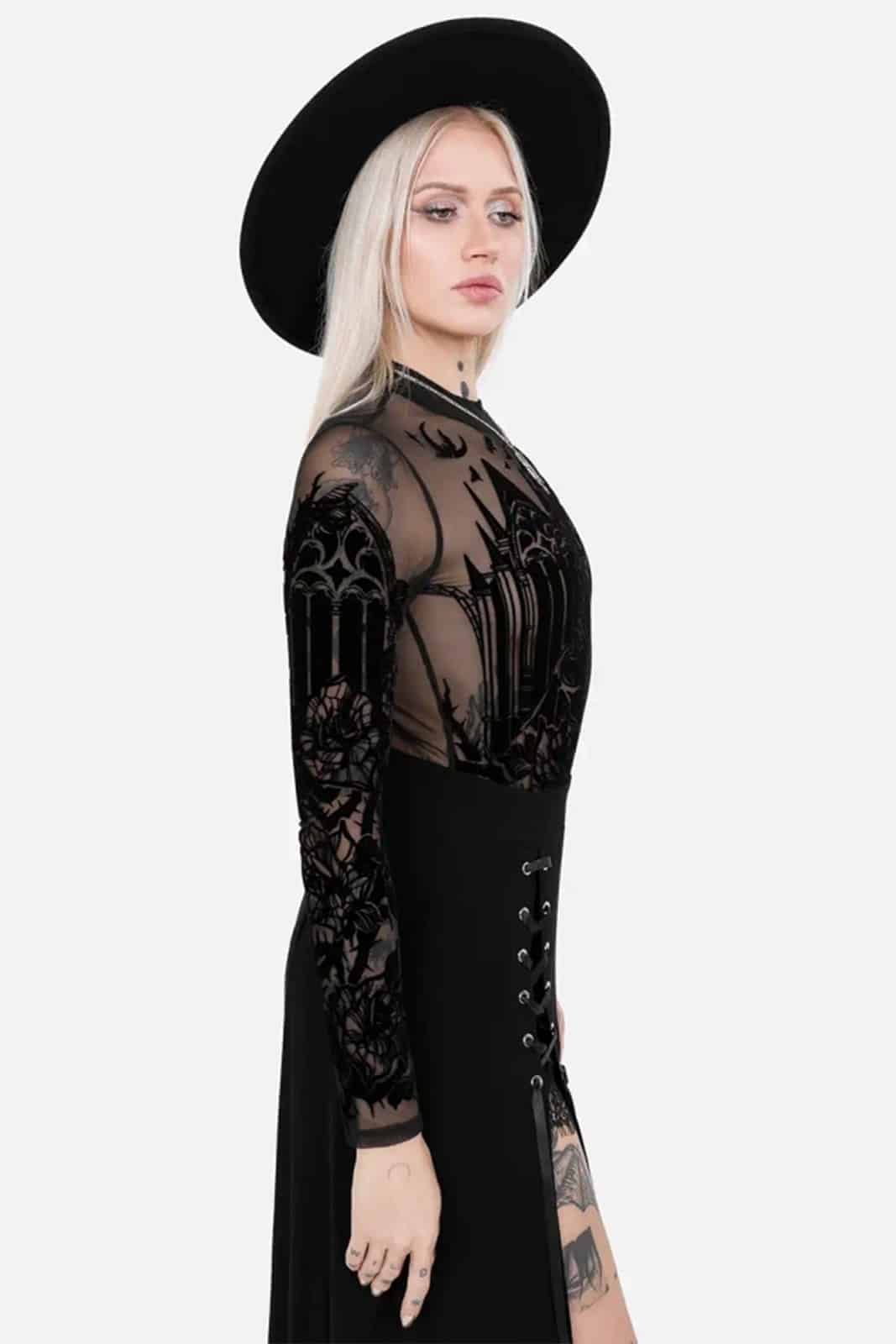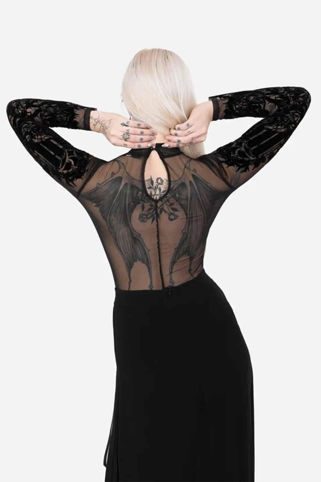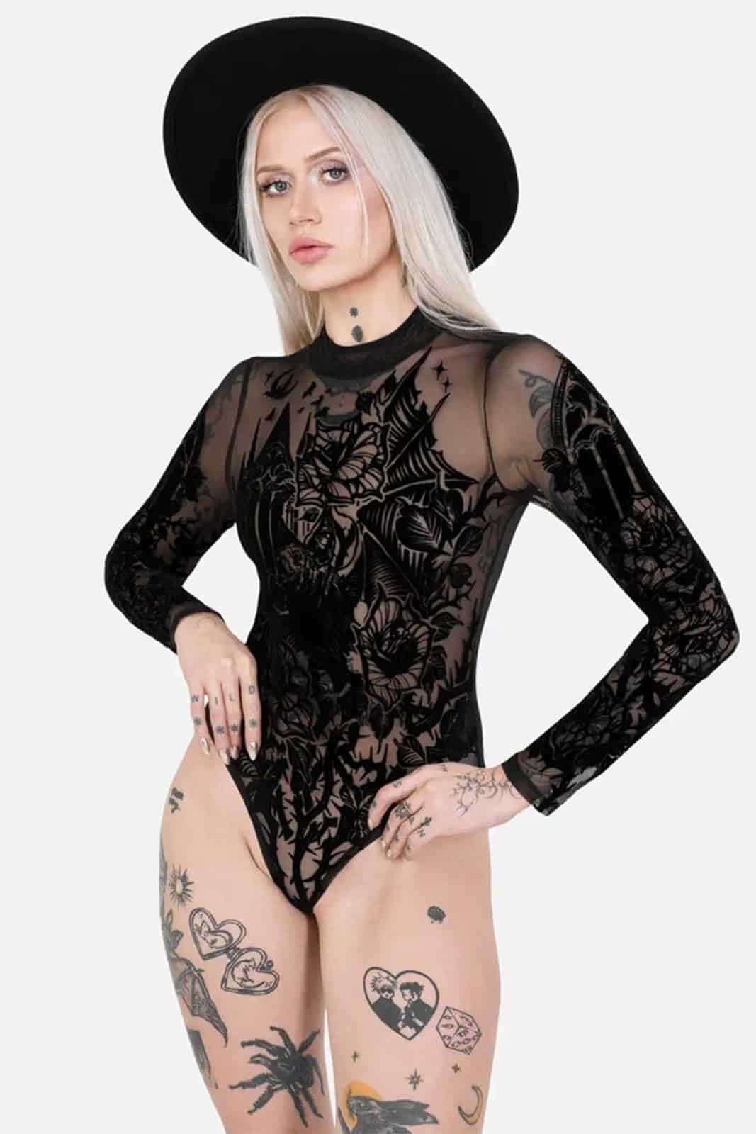 Wie ein Schattenriss einer vergessenen Kathedrale legt sich dieser transparente Body über die Haut und verbindet dunkle Romantik mit filigraner Mystik. Der samtige Flockdruck aus Fledermaus, gotischen Fenstern und floralen Elementen wirkt wie ein nächtliches Kunstwerk und macht das Piece zu einem ausdrucksstarken Highlight für Gothic- und Dark-Fantasy-Looks.