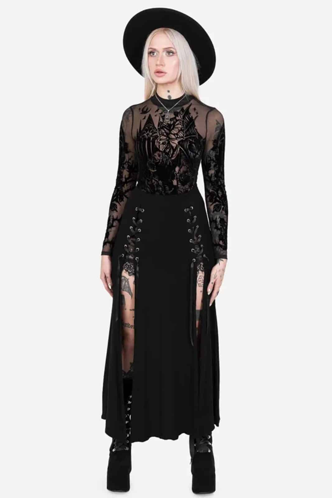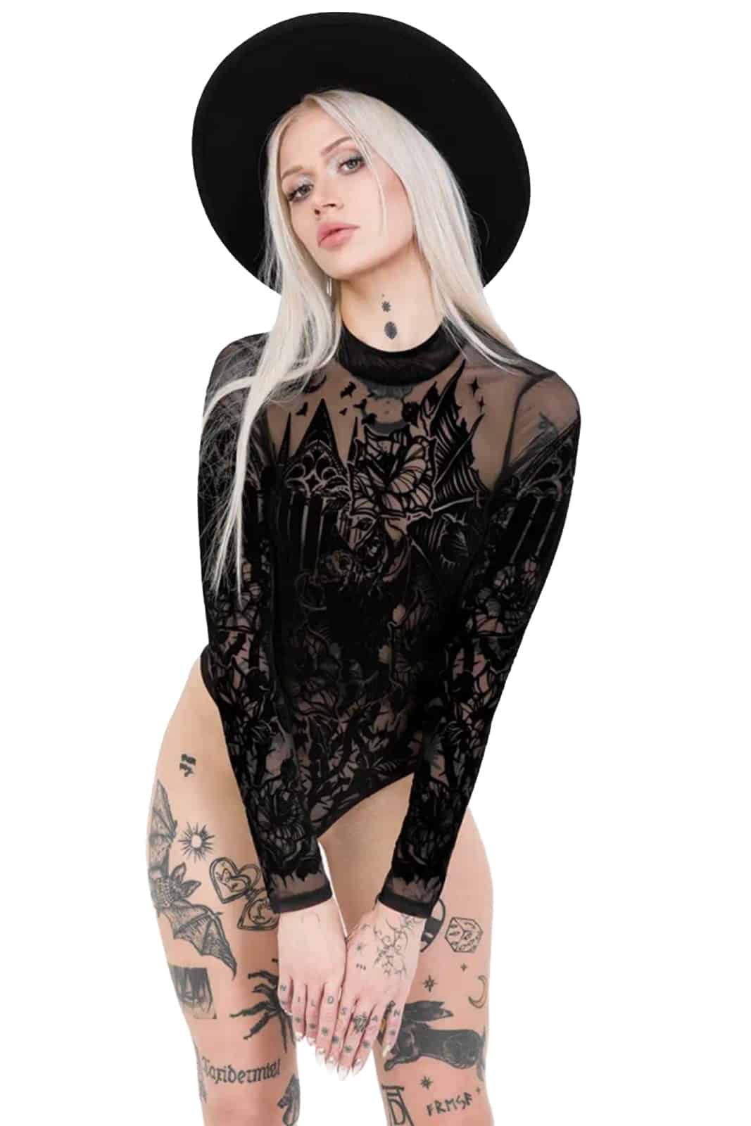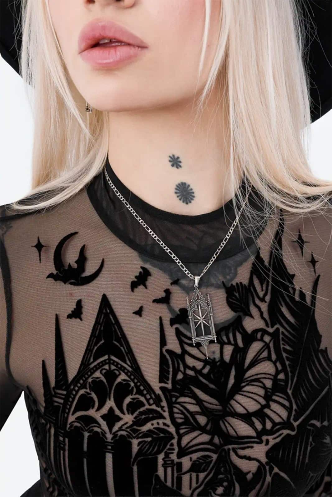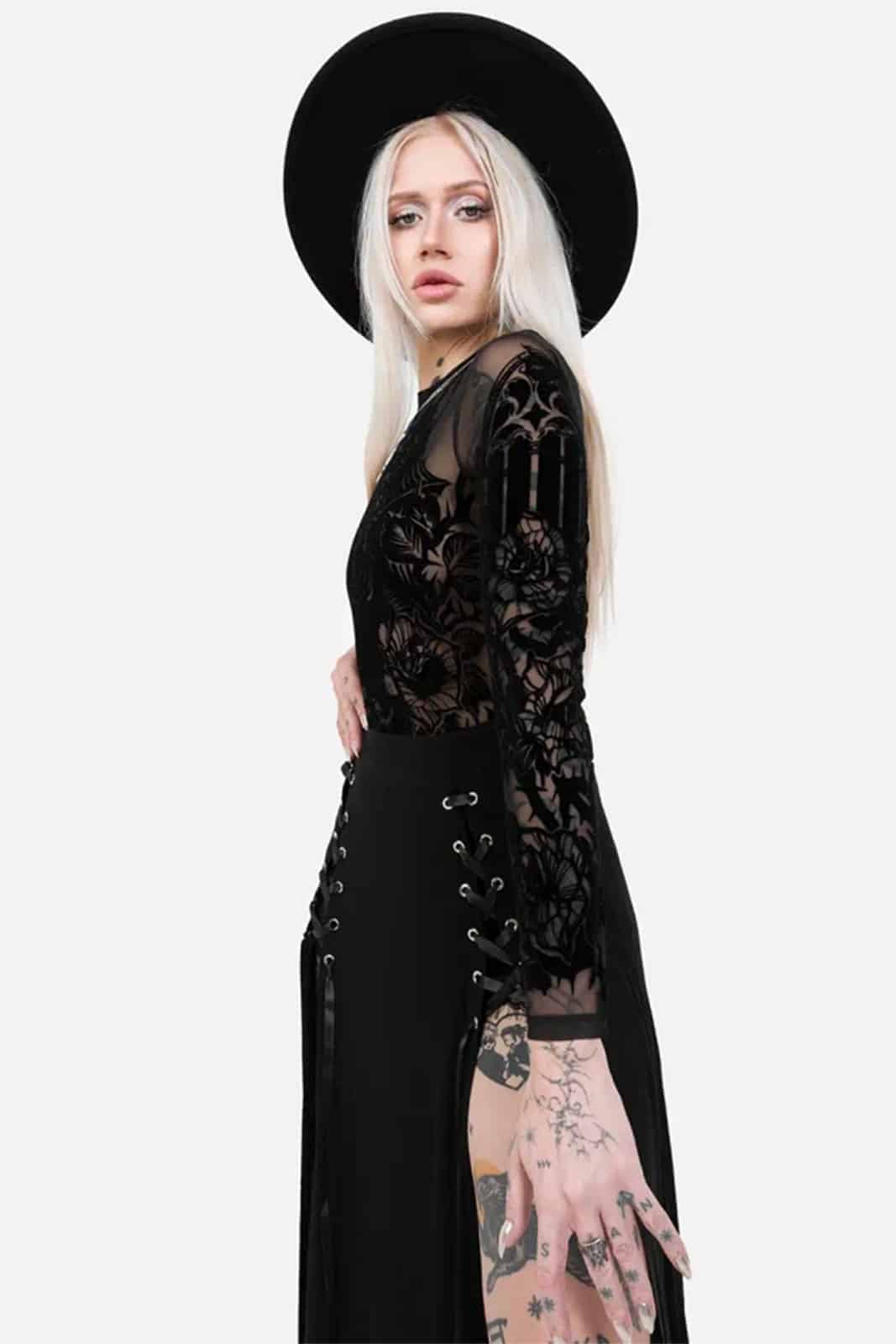 Wie ein Schattenriss einer vergessenen Kathedrale legt sich dieser transparente Body über die Haut und verbindet dunkle Romantik mit filigraner Mystik. Der samtige Flockdruck aus Fledermaus, gotischen Fenstern und floralen Elementen wirkt wie ein nächtliches Kunstwerk und macht das Piece zu einem ausdrucksstarken Highlight für Gothic- und Dark-Fantasy-Looks.