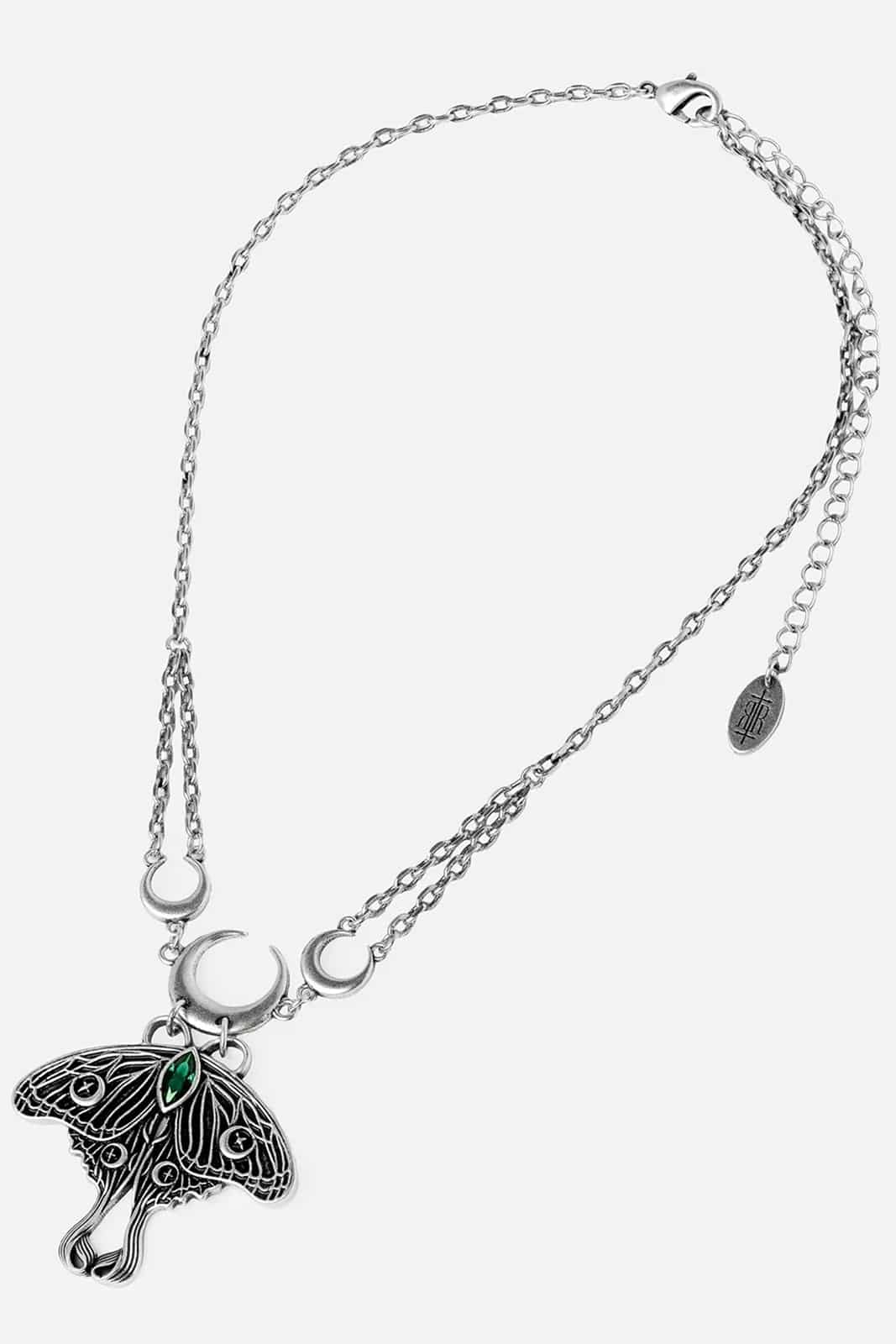 Diese himmlische Motten-Halskette schöpft ihre Kraft aus Waldlegenden und der Symbolik des Mondes. Im Zentrum befindet sich ein detailreicher Gothic-Motten-Anhänger mit einem tief smaragdgrünen Kristall. Halbmonde rahmen das Design ein und verleihen ihm eine geheimnisvolle Bedeutung. Das Schmuckstück verbindet magische Ästhetik mit naturinspirierten Details. Die verstellbare Kette ermöglicht es, die Halskette als hexenhaften Choker oder als kurzes, mystisches Collier zu tragen – ideal für Waldhexen, Dark-Fae-Looks und Fans okkulter Mode. Ein einzigartiges Forestcore-Accessoire für nächtliche Seelen.
