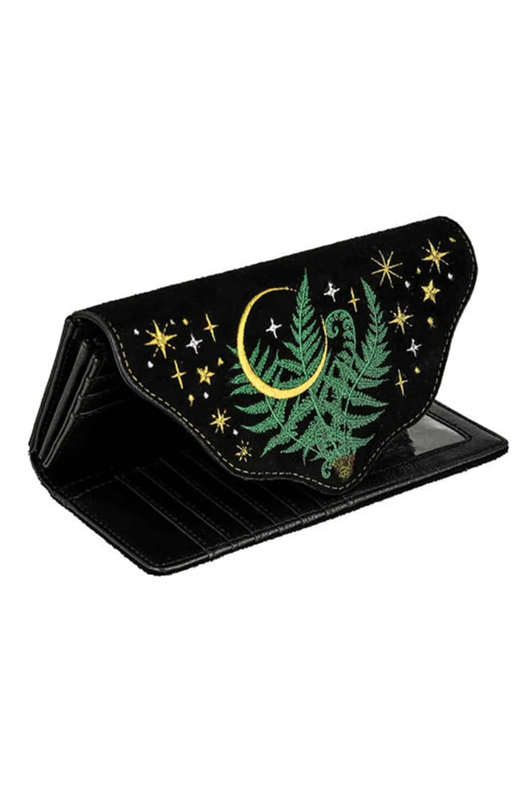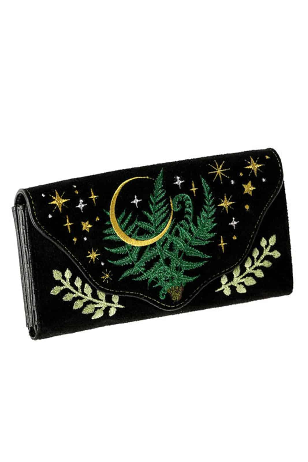 Das Portemonnaie ist länglich und besteht aus Wildlederimitat mit einer Innenseite aus Kunstleder. Es ist sehr einfach und bequem zu öffnen. Seine Vorderseite ist mit gestickten Blumenmotiven verziert: Kräuter, Farne, Zweige. Der einzigartige Charme und das Design sind jedoch nicht die einzigen Vorteile dieser Gothic-Geldbörse: Sobald Du sie öffnest, wirst Du von der Vielzahl an Fächern überrascht sein. Ihr Inneres verfügt außerdem über ein dreifaches Geldscheinfach und ein Münzfach mit Reißverschluss. Es gibt viel Platz für Kreditkarten und Visitenkarten sowie zwei zusätzliche versteckte Fächer.