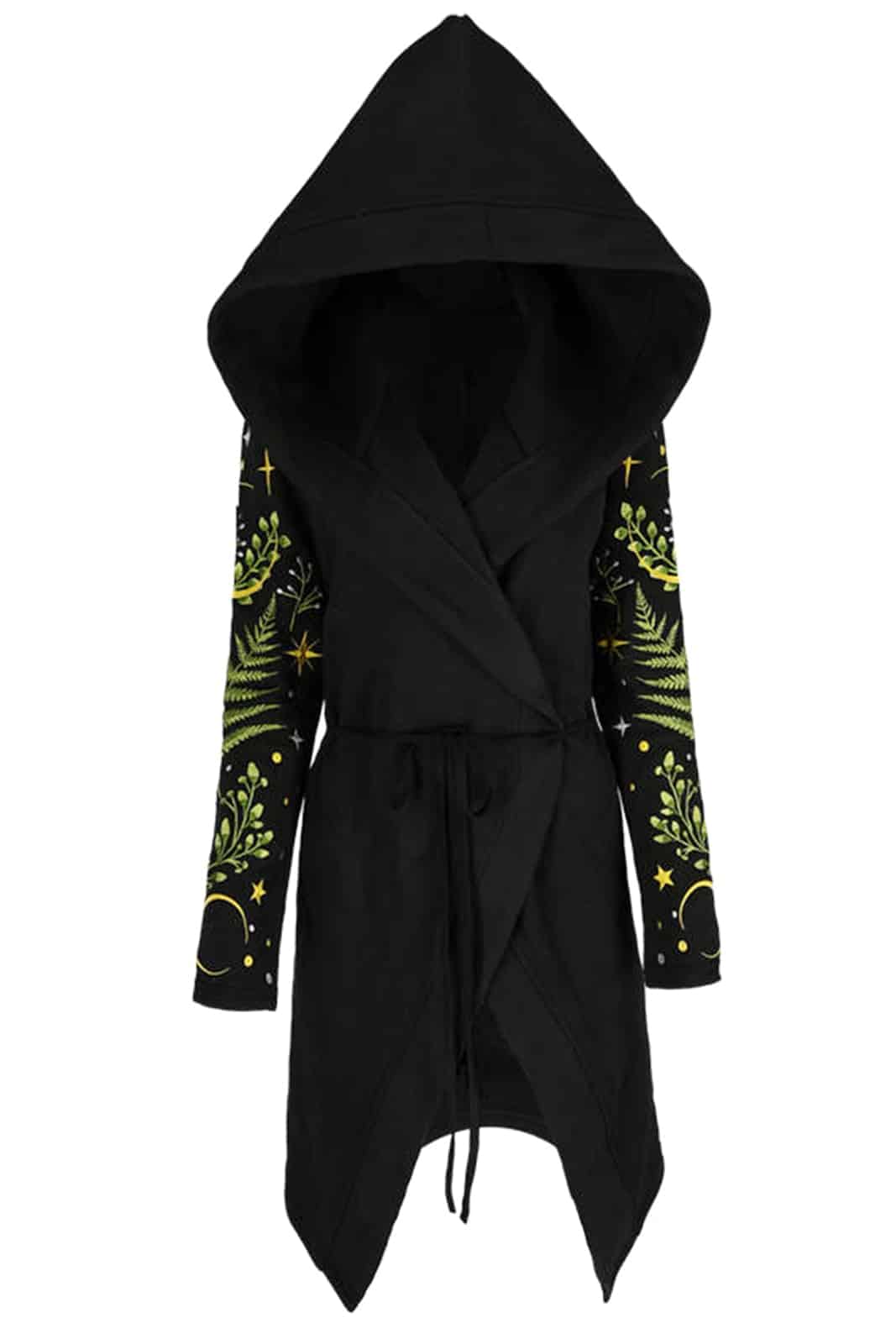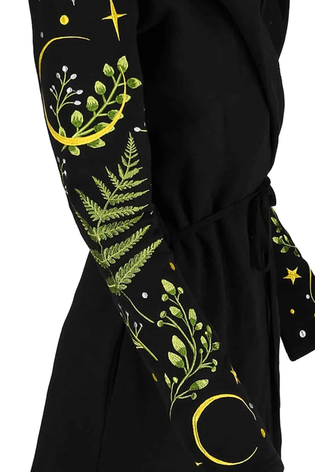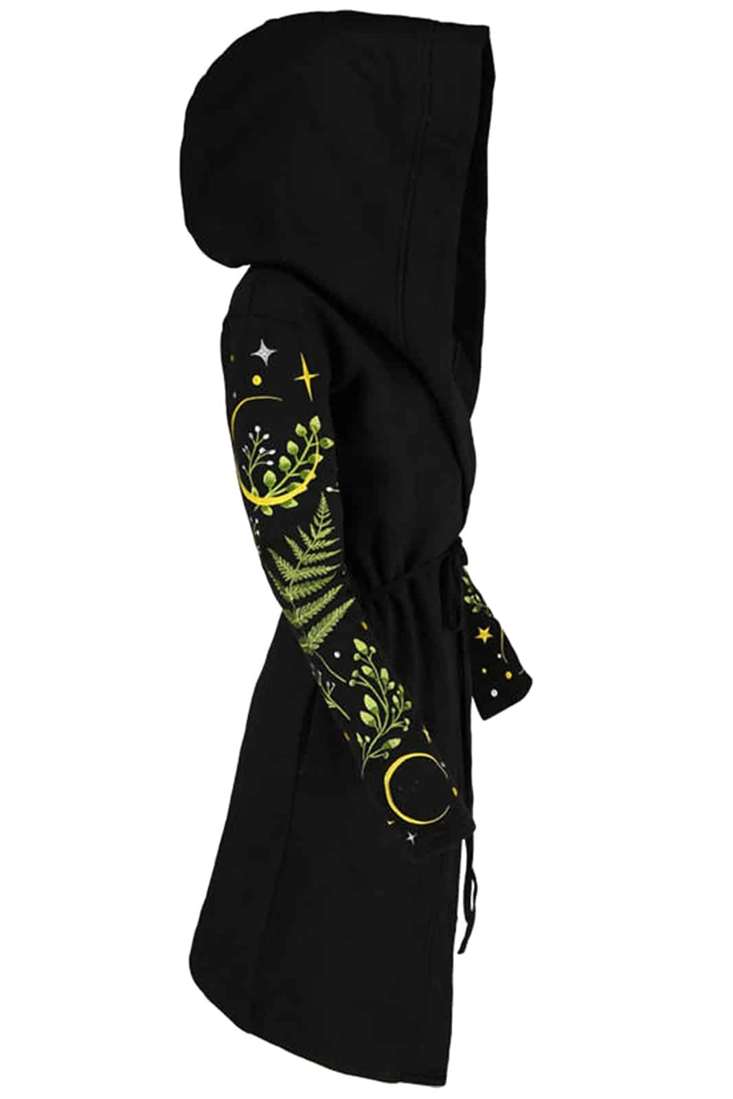 Das Hoody besteht aus dickem Baumwollstoff, der Wärme und Komfort bietet. Seine Robenform und die geräumige Kapuze machen ihn perfekt für kältere Tage. Es ist innen mit einem schönen Flaum bedeckt, der den Körper angenehm umhüllt. Auf den Ärmeln hat er ein sehr realistisches Farnmuster, das mit einem Sternenmotiv bestickt ist, was perfekt zu seinem Gothic-Charakter passt.