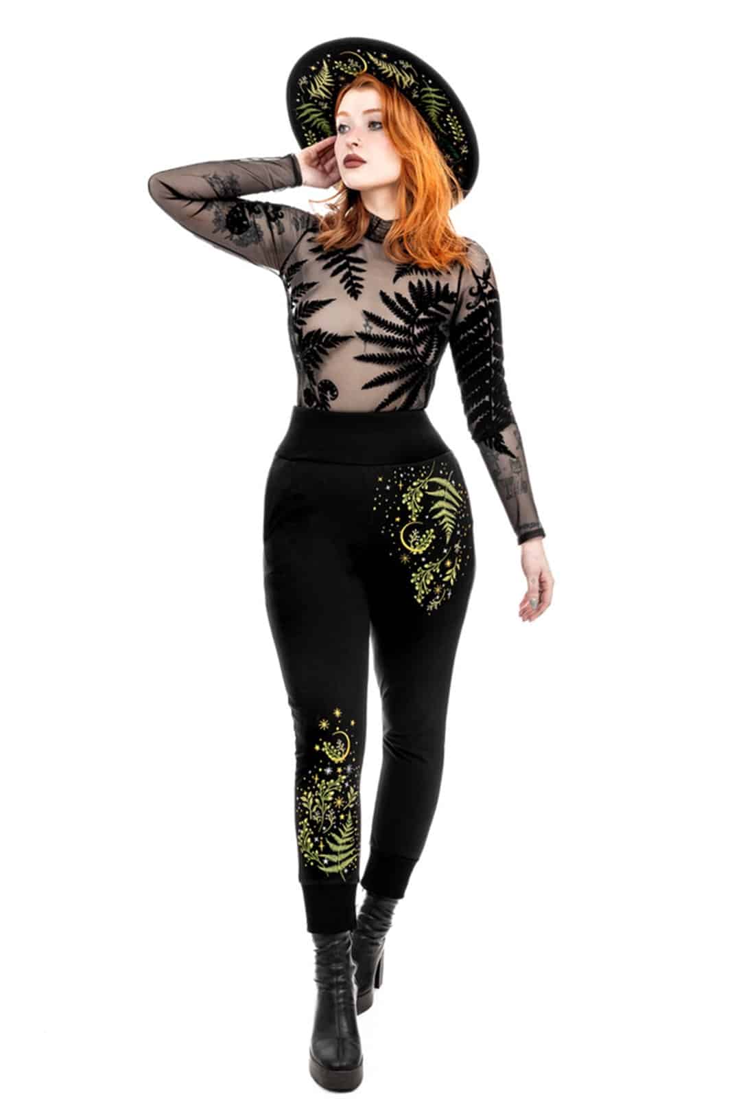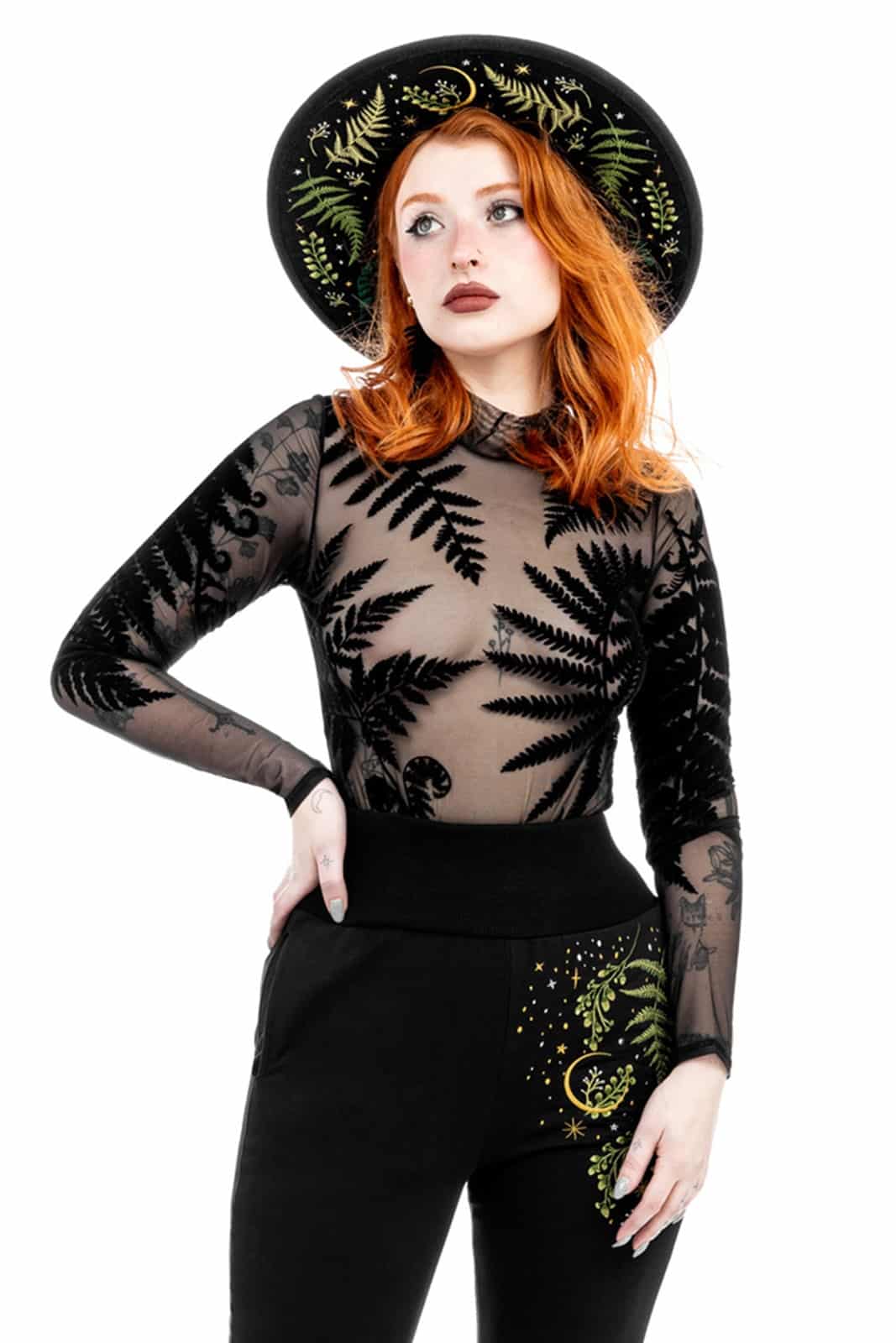 Wunderschöner Hut aus Wollfilz. Die 10cm breite Krempe ist mit einem einzigartigen Finish verziert. Üppige, botanische Stickerei aus Farnblättern und verschiedenen Waldpflanzen, durchsetzt mit Halbmonden und Sternen. Warmes Waldgrün und luxuriöses Gold schaffen eine wunderbare visuelle Harmonie, die die Schönheit der Natur widerspiegelt