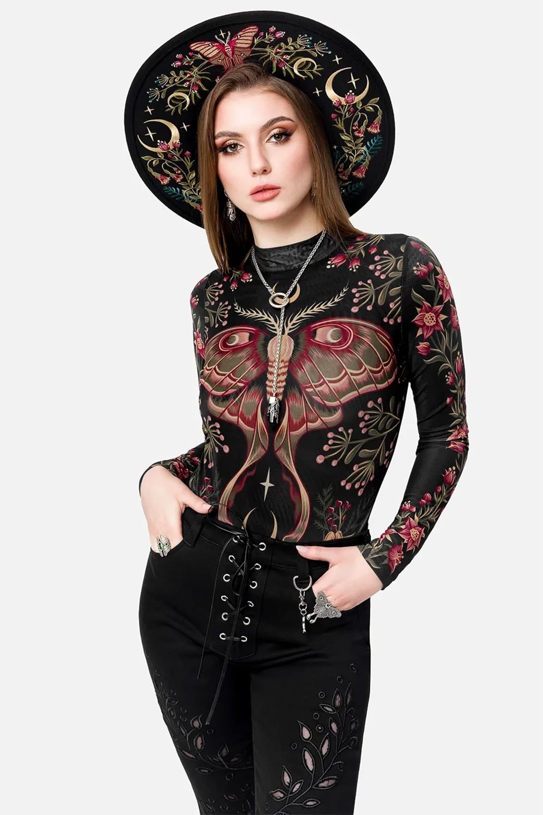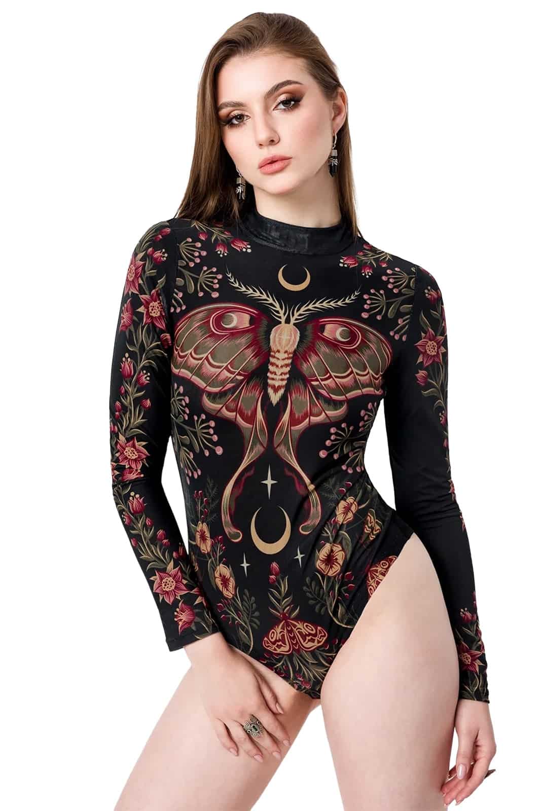 Ein Stück Nachtsymbolik zum Tragen. Der Bodysuit zeigt eine majestätische Motte, deren Flügel sich wie ein kleines Kunstwerk über die gesamte Vorderseite erstrecken. Umgeben von floralen Ornamenten, feinen Ranken und Mondsicheln wirkt das Design wie aus einem geheimen Waldtempel – mystisch, romantisch und ein Hauch okkult. Der Stoff ist weich, anschmiegsam und dehnbar, sodass sich der Body wie eine zweite Haut anfühlt. Perfekt für Layering, Festivals, Clubnächte oder als Statement im Alltag – ein Blickfang, der leise flüstert, statt laut zu schreien.