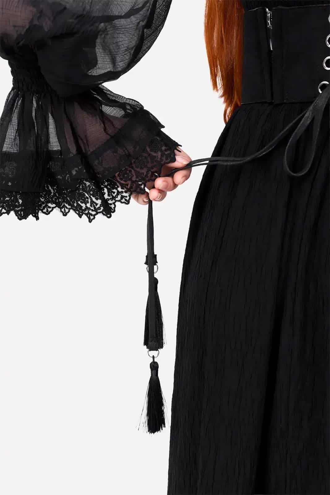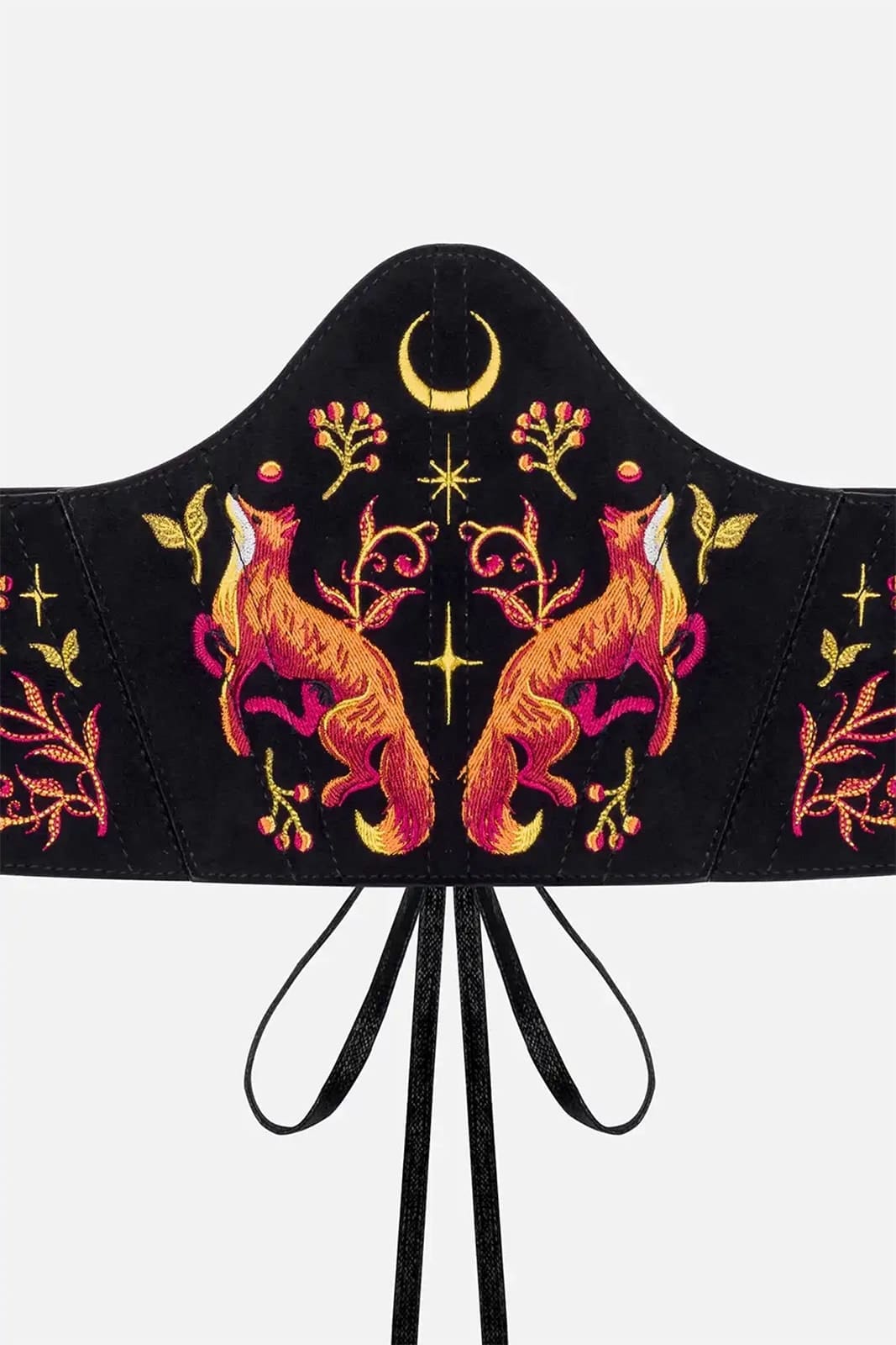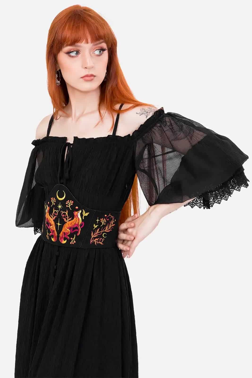 Ein kraftvoller Unterbrust-Corsagegürtel mit intensiver, naturinspirierter Ausstrahlung. Gefertigt aus tiefschwarzem Kunstwildleder und verziert mit einer detailreichen, feurig wirkenden Stickerei aus Füchsen und floralen Elementen. Die symmetrische Gestaltung betont die Taille und verleiht jedem Outfit eine markante, mystische Note. Ideal für Dark-Fantasy-, Witchy- oder naturverbundene Looks, bei denen Stärke und Eleganz im Mittelpunkt stehen.