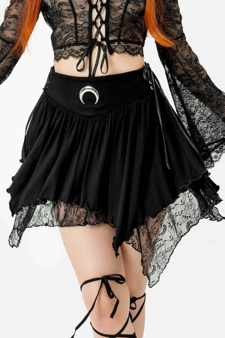 Der Spellbound Minirock ist ein Traum aus Geheimnis und Magie, mit mehrlagigen Rüschen und zarter Spitze, die sich wie Schatten im Mondlicht bewegen. Weich, fließend und mühelos bezaubernd.
