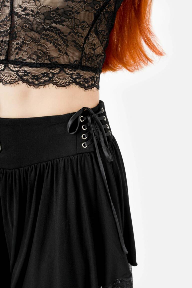 Zipfel-Minirock in schwarz mit Unterrock aus floraler Spitze.