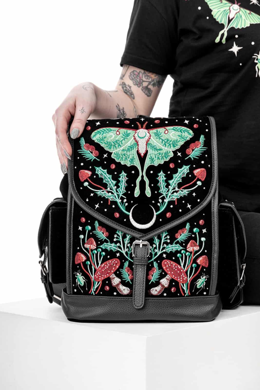 Mit einer atemberaubenden Luna Moth-Stickerei ist es, als ob Sie ein Stück Magie überallhin mitnehmen würden!Verzauberte Pilze, Käfer, Waldpflanzen, Sterne und Halbmonde in tiefen Retro-Farben mit faszinierender Textur.