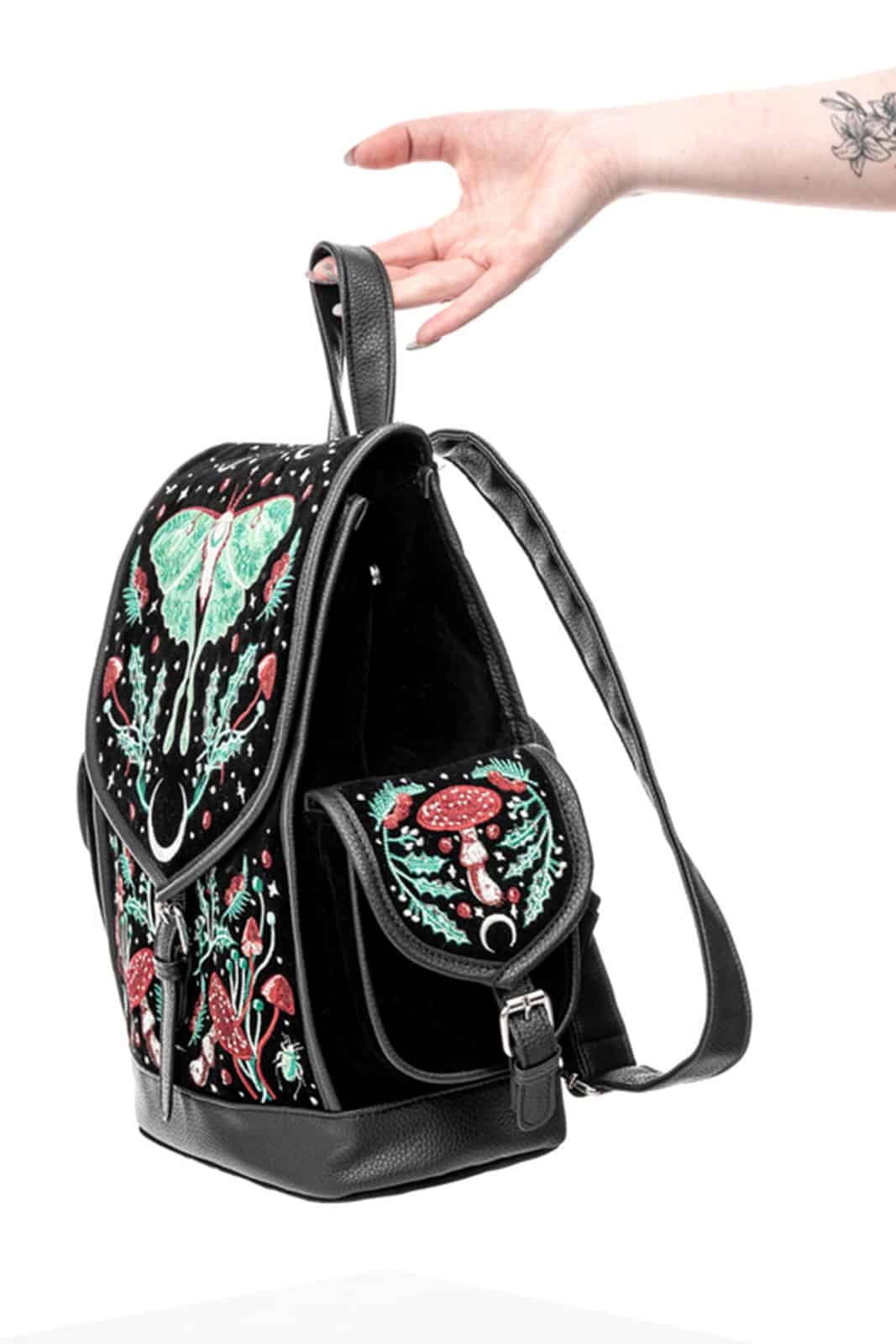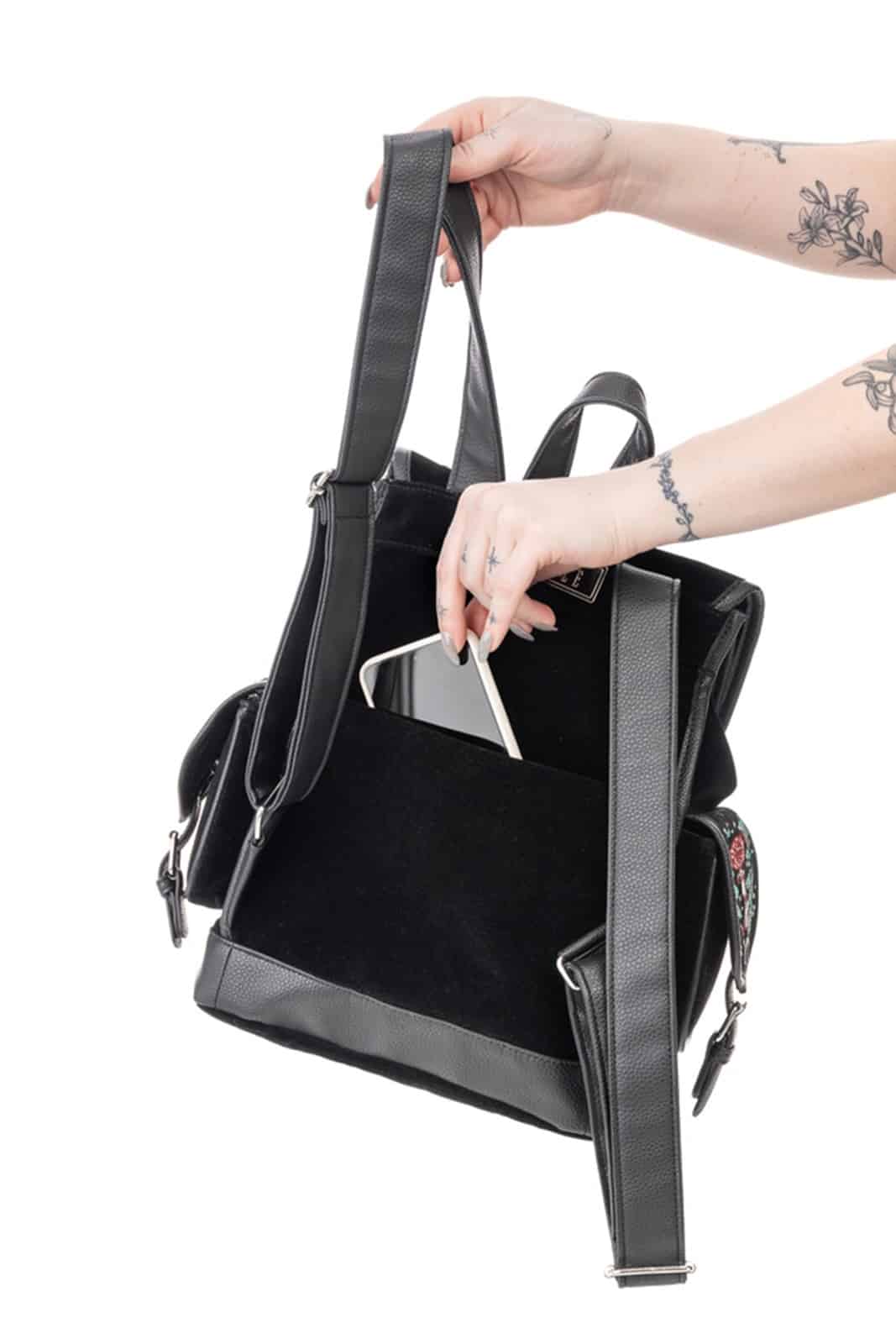 Gefertigt aus tiefschwarzem Samt und dezent glänzendem Kunstleder. Mit sicheren Magnetverschlüssen und Schnallen für mehr Komfort und einem Reißverschluß für das Hauptfach. Auf der Rückseite mit einer weiteren Reißverschlußtasche für zusätzlichen Stauraum. Als Zipper dient ein silberner Mondanhänger.