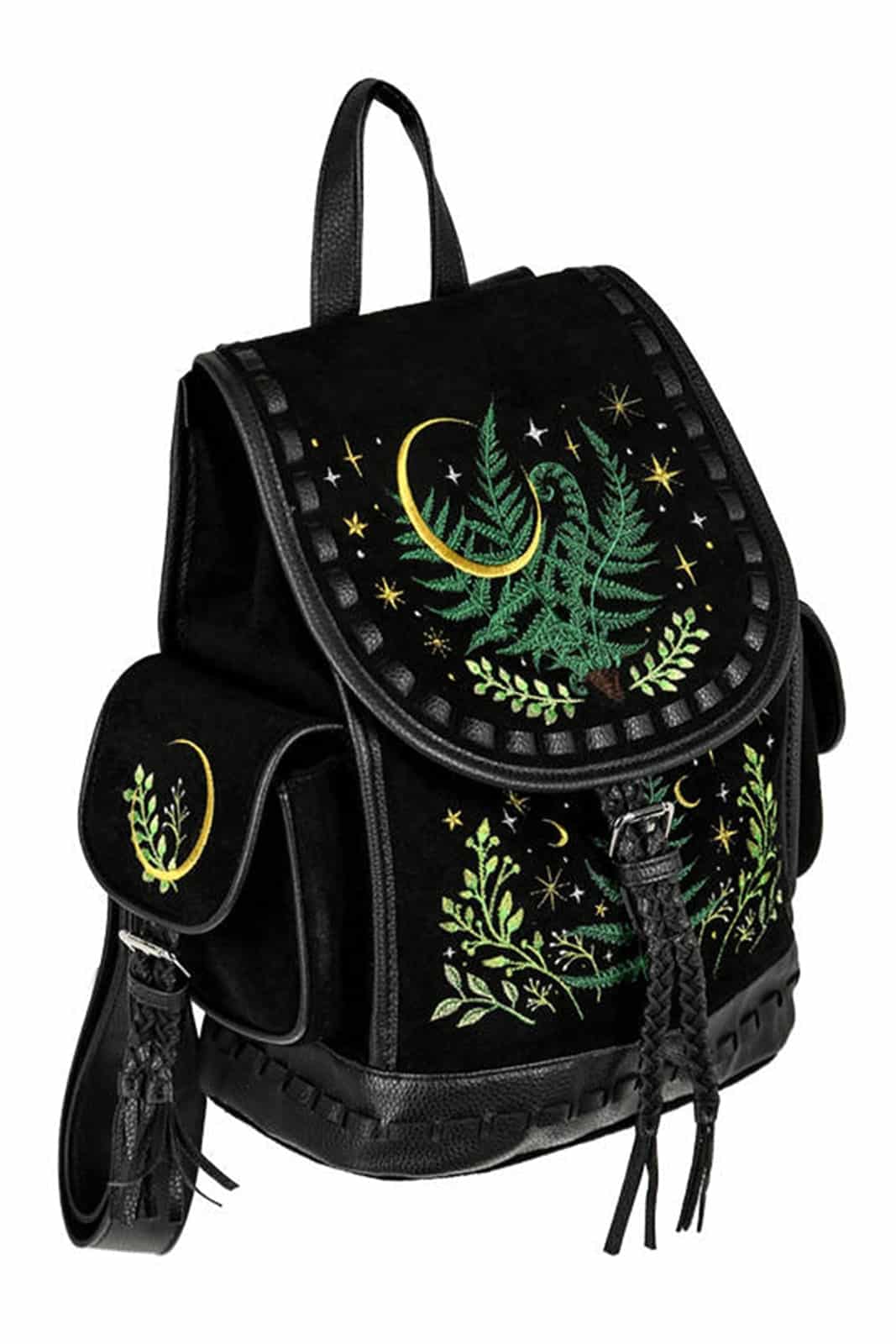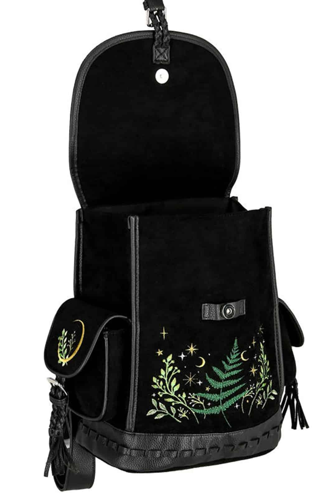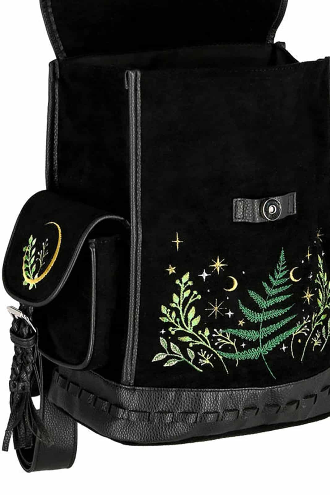 Aufwändige Stickereien und reichhaltige, dekorative Stichmuster verschönern die gesamte Vorderseite des Rucksacks. Wunderschön gestickte Farnblätter, umgeben von Sternen, Zweigen und Kräutern, ziehen die Aufmerksamkeit auf sich. Dieser Gothic-Rucksack ist aus Samt gefertigt und hat zwei große Seitentaschen. Unter dem praktischen Magnetkopf findet sich ein zusätzlicher Gurt zum Schließen des Rucksacks.