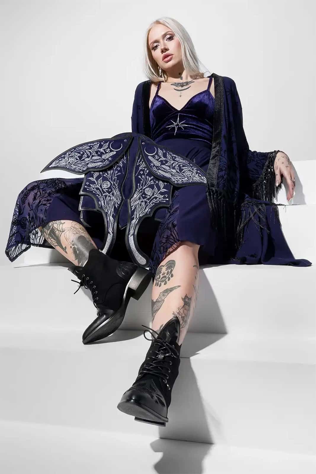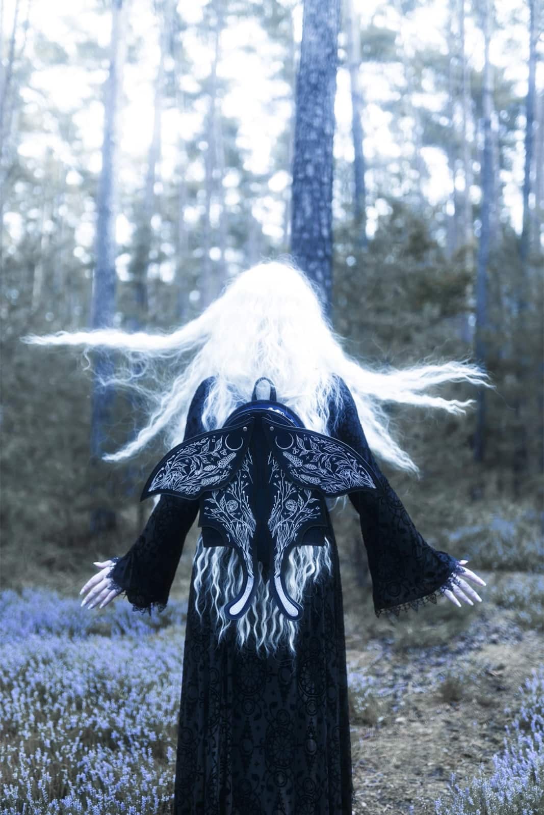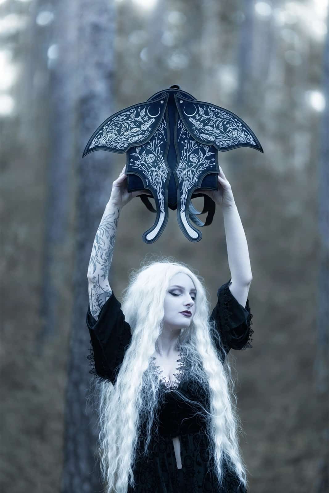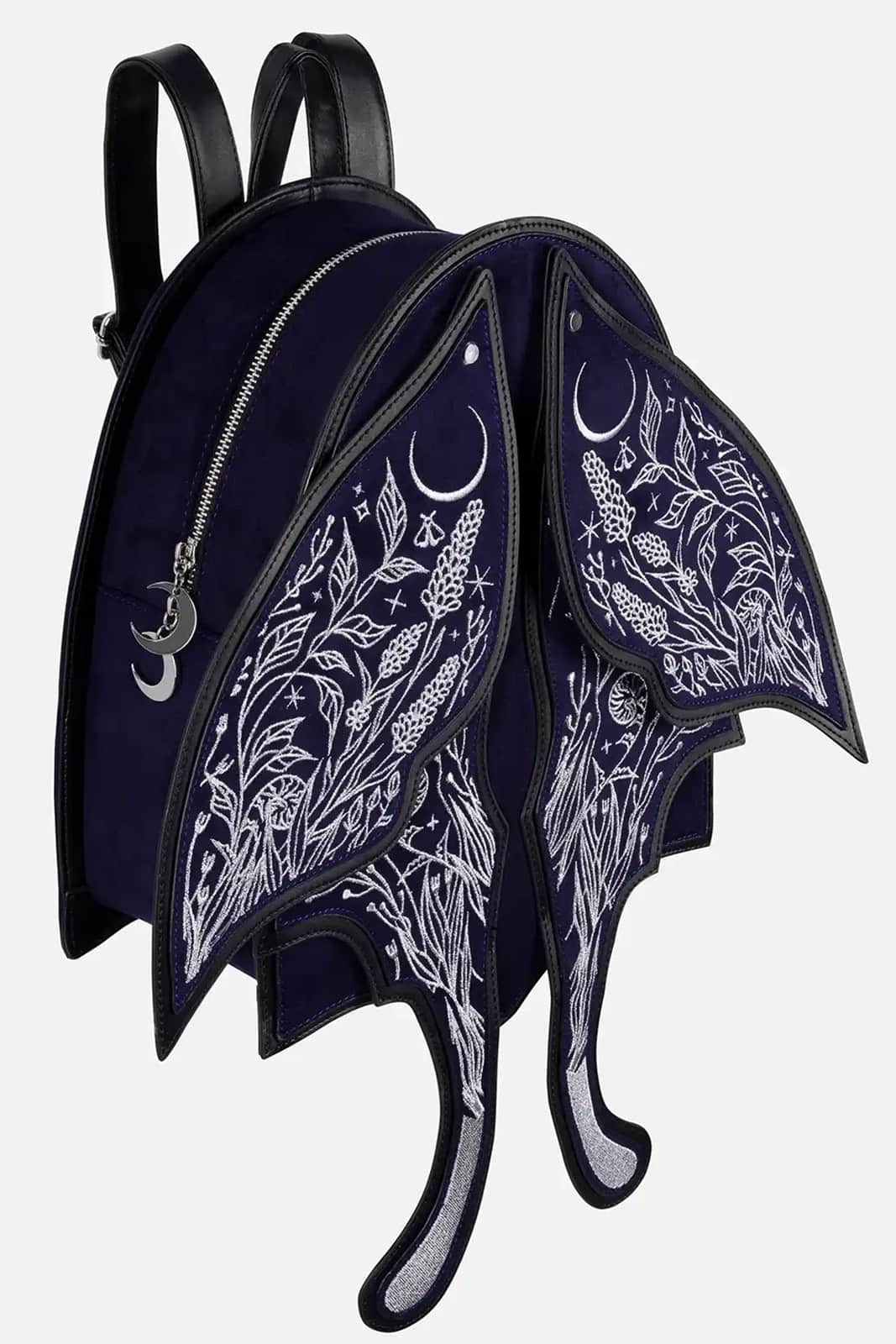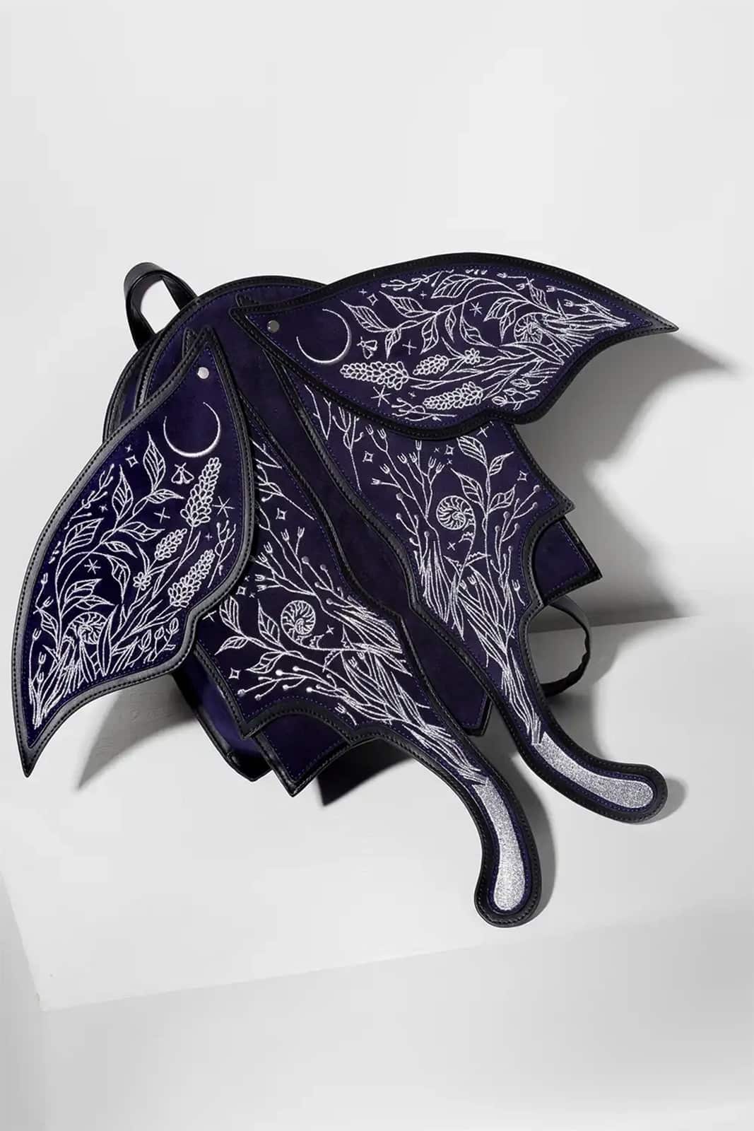 Umbra Noctis ist ein außergewöhnlicher Fantasy-Rucksack, der weit mehr ist als ein funktionales Accessoire. Er vereint dunkle Eleganz mit kosmischer Symbolik und wirkt wie ein tragbares Relikt der Nacht: Die silbern schimmernden Stickereien zeigen nachtblühende Pflanzen, filigrane Zweige, Sterne und Halbmonde – eingefasst in eindrucksvolle, bewegliche 3D-Flügel. Die schildförmige Silhouette, die schwarzen PU-Kontrastbesätze und die Mond-Details an den Zippern machen ihn zum perfekten Begleiter für Gothic-, Dark-Fairycore- und Festival-Looks – geheimnisvoll, magisch und absolut einzigartig.