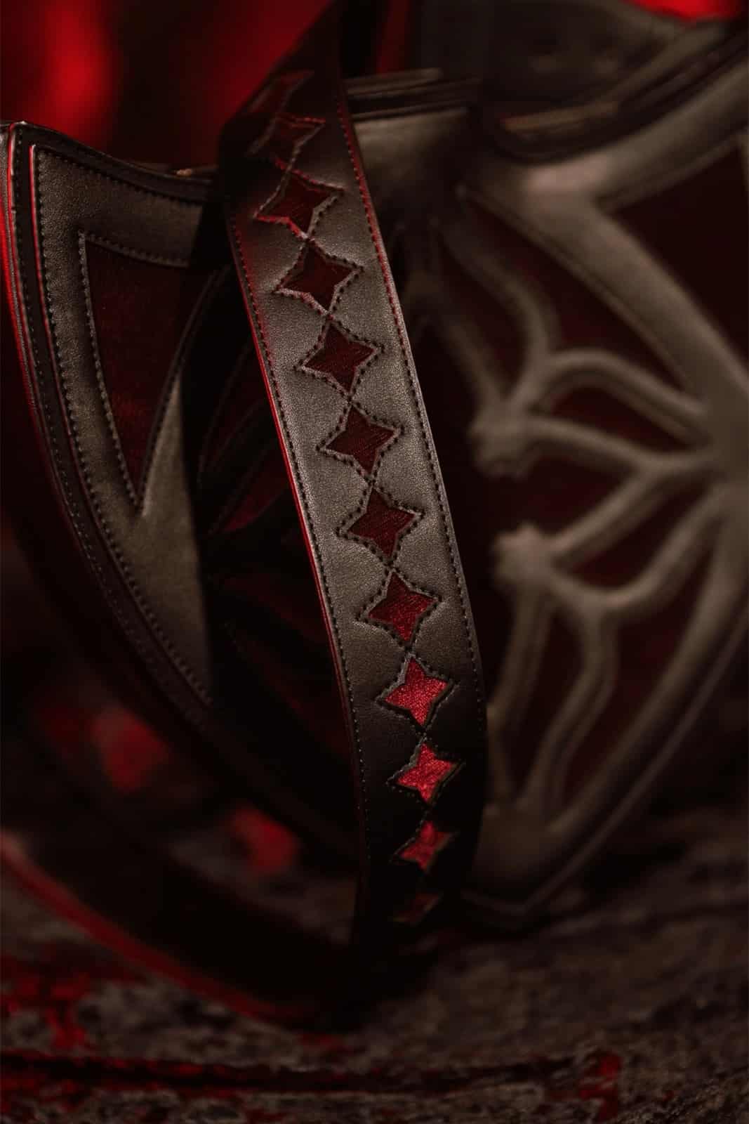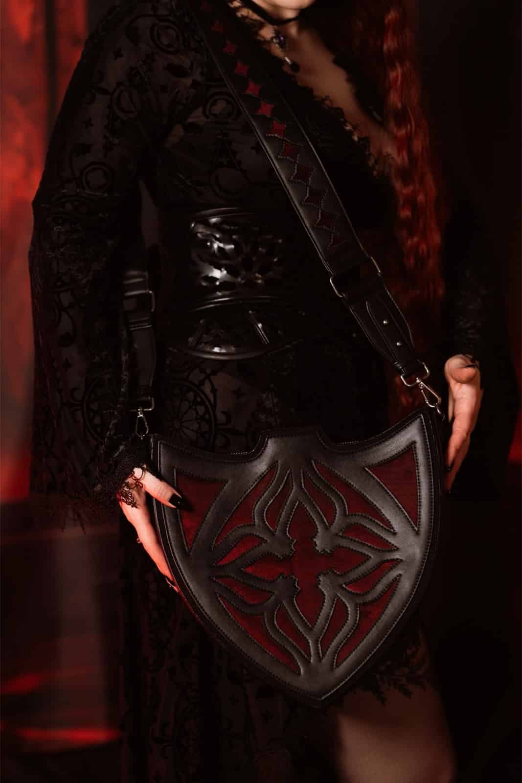 Wie ein Relikt aus vergessenen Kathedralen erhebt sich diese Tasche in markanter Schildform und verbindet dunkle Romantik mit kraftvoller Symbolik. Der tiefrote Samt, durchzogen von filigranen, gotisch inspirierten Linien, wirkt wie ein verborgenes Ornamentspiel aus Licht und Schatten und verleiht jedem Look eine dramatische, edle Ausstrahlung.
