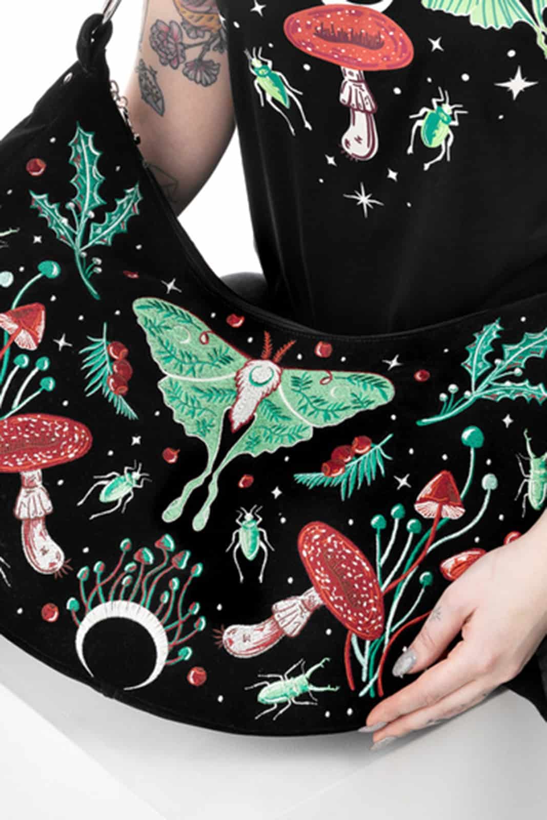 Gefertigt aus einer luxuriösen und tiefschwarzen Samtkonstruktion. Mit einer atemberaubenden Stickerei mit Luna-Motte, Fliegenpilzen, Zauberpilzen, Käfern, Waldpflanzen und funkelnden Sternen auf Körper und Riemen. Das Hauptfach ist ausgestattet mit Reißverschluss für Sicherheit und Komfort.Die Rückseite ist mit einer kleinen Reißverschlusstasche für einfachen Zugriff auf Deine wichtigsten Dinge ausgestattet. Silberne Mondanhänger verleihen einen Hauch von himmlischem Charme. Im Inneren befinden sich zwei praktische Taschen: eine Reißverschlusstasche und eine Einschubtasche