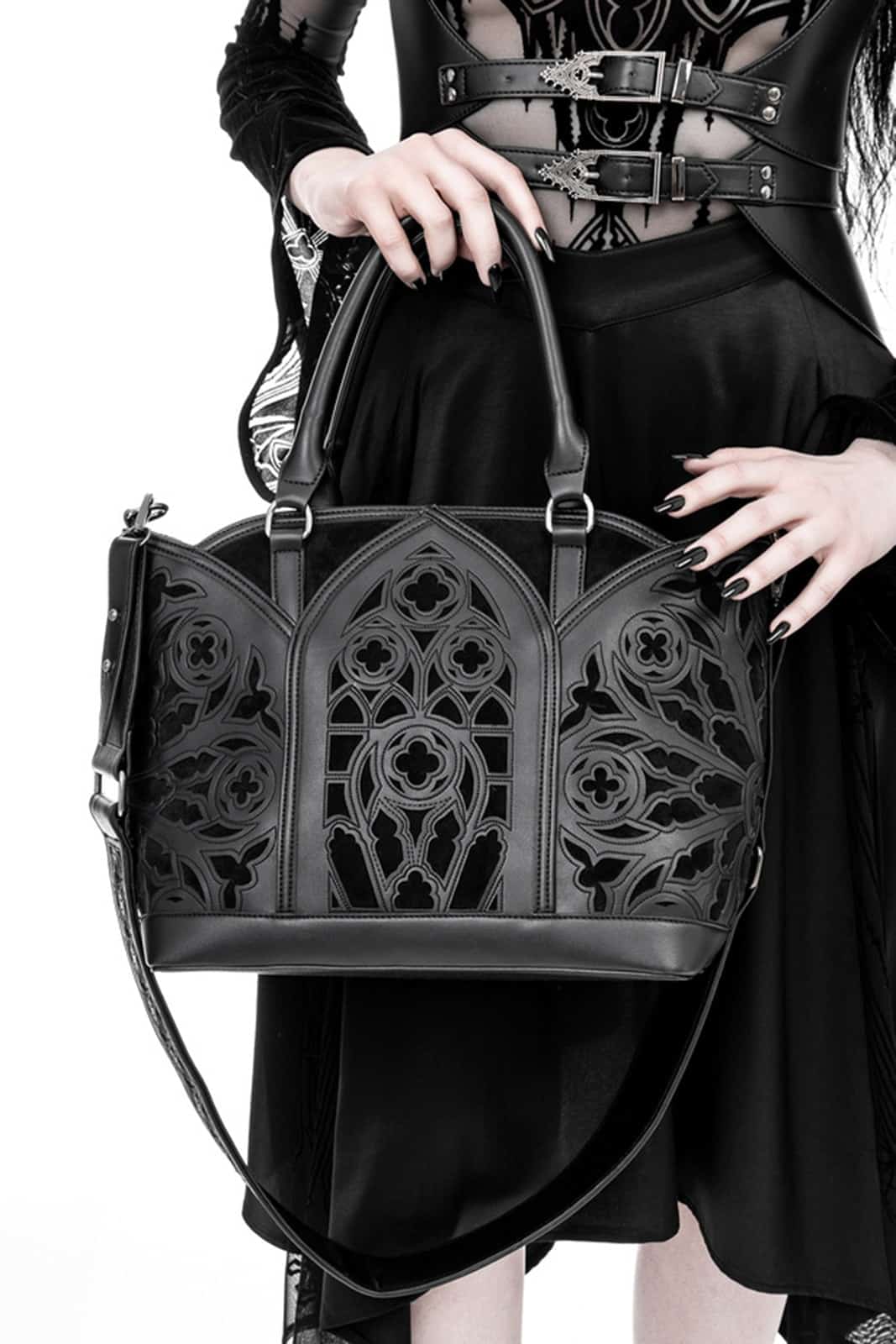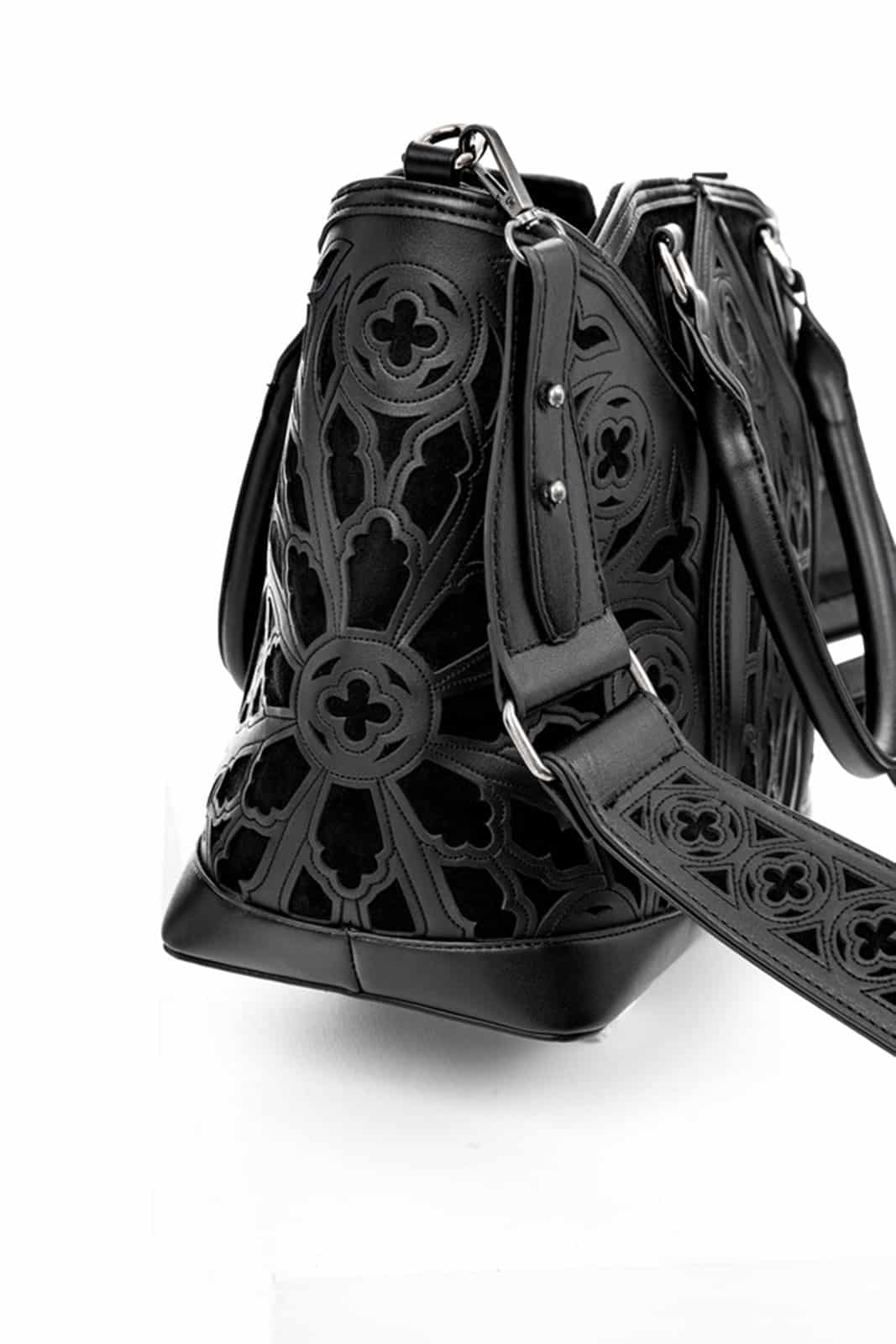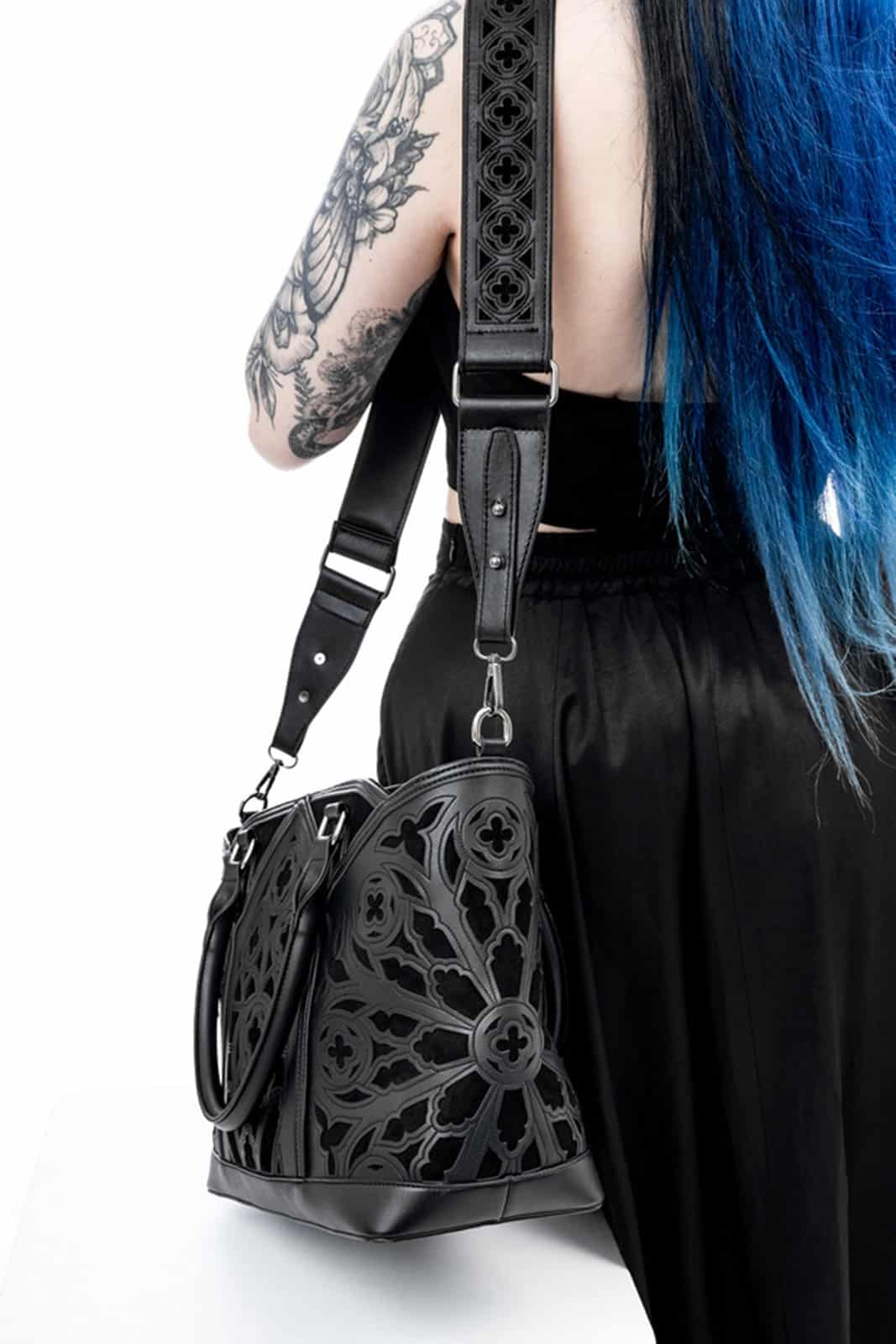Diese schwarze Gothic-Shopper-Tasche ist ein Meisterwerk der Konstruktion! Mit ihren Bögen und rosettenartigen Verzierungen erinnert sie an die Pracht einer gotischen Kathedrale. Ihre Form und Muster spiegeln die ikonischen architektonischen Elemente wider und bieten ein zeitloses Accessoire für alle Liebhaber des Gothic-Stils.
