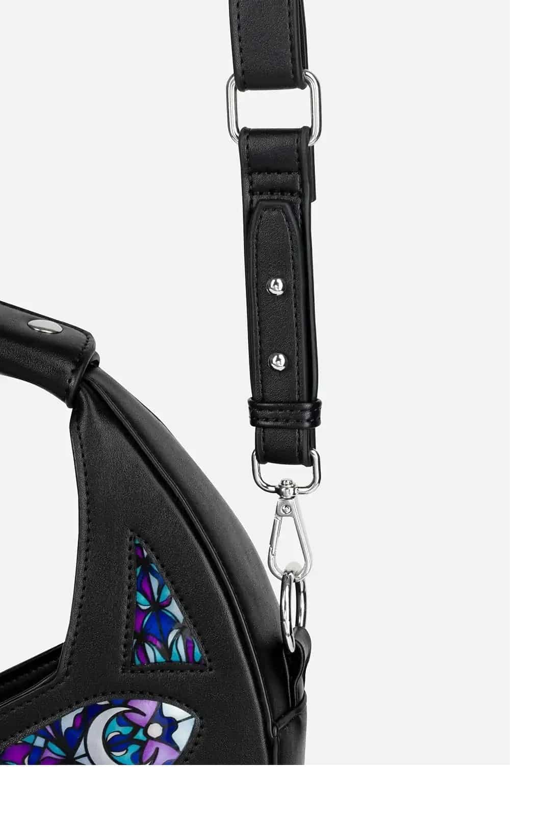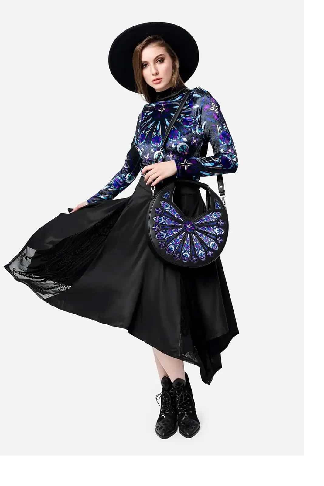 Ein Schmuckstück in Taschenform – inspiriert von den leuchtenden Rosetten gotischer Kathedralen. Das violett-blau schimmernde Muster erinnert an farbiges Glas, durch das das Licht geheimnisvoll bricht. Die sorgfältig gearbeiteten Laser-Cut-Details und der plastische Aufbau verleihen der Tasche Tiefe und Struktur. Elegant, symbolisch und voller mystischer Aura – ein Highlight für Liebhaberinnen dunkler, kunstvoller Ästhetik.