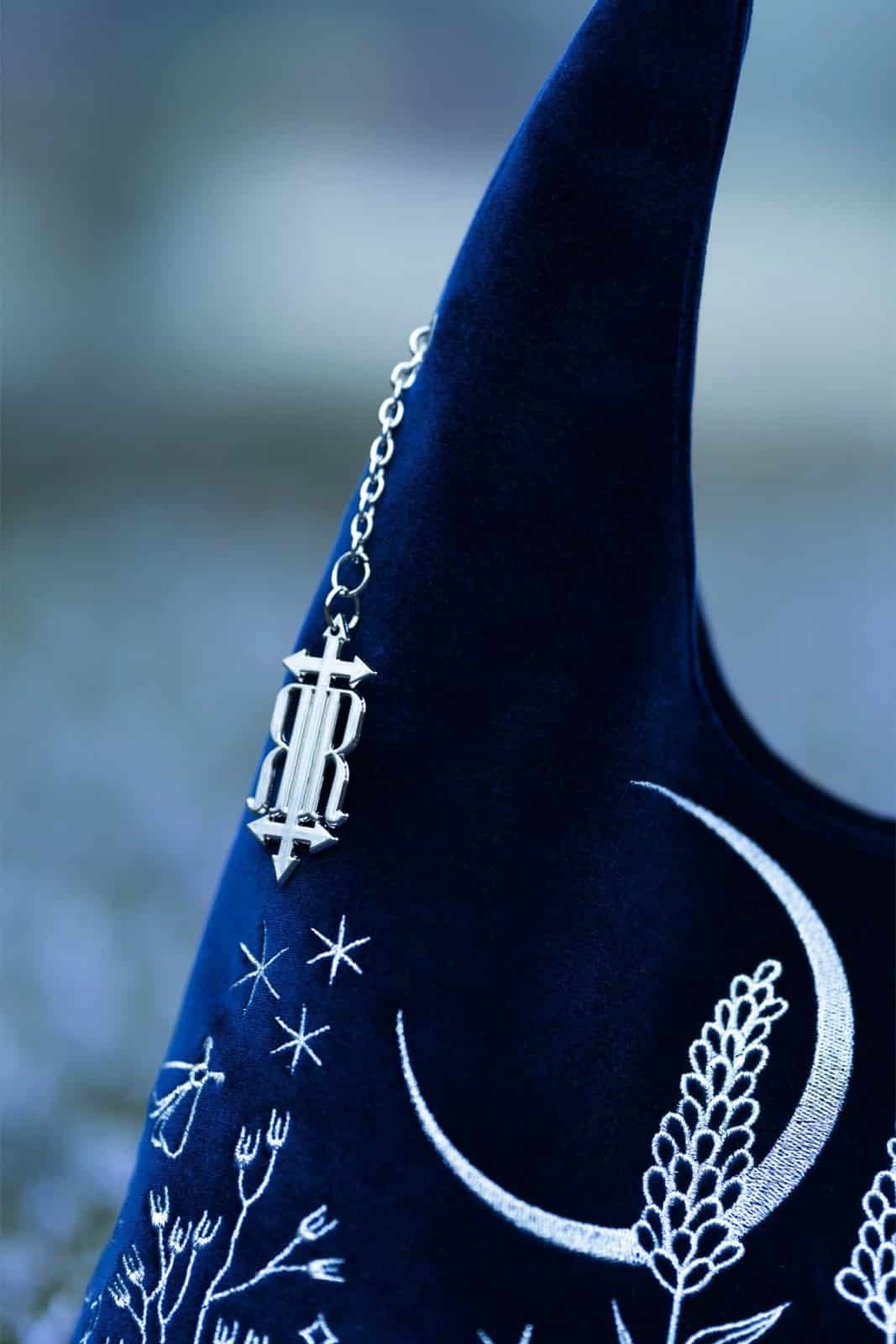 Eine große Samttasche im tiefen midnight blue, die die Magie des Nachthimmels einfängt. Der samtige Untergrund wird von filigranen silbernen Stickereien aus mondbeschienenen Wiesen, Luna-Motten, Farnen, nachtblühender Flora, Sternen und einem Halbmond durchzogen. Elegant und zugleich leicht verspielt wirkt diese Tasche wie ein tragbares Fragment der Nacht und passt perfekt zu Gothic-, Boho- oder Celestial-Looks – ideal für Alltag, Arbeit oder besondere Ausflüge.