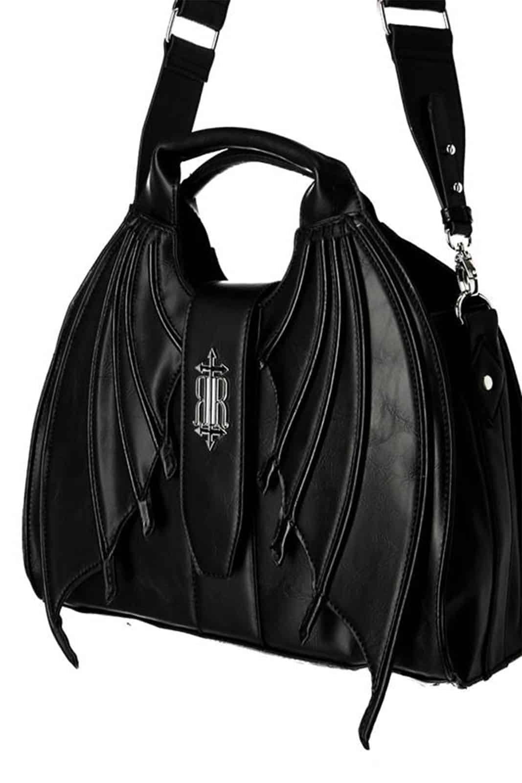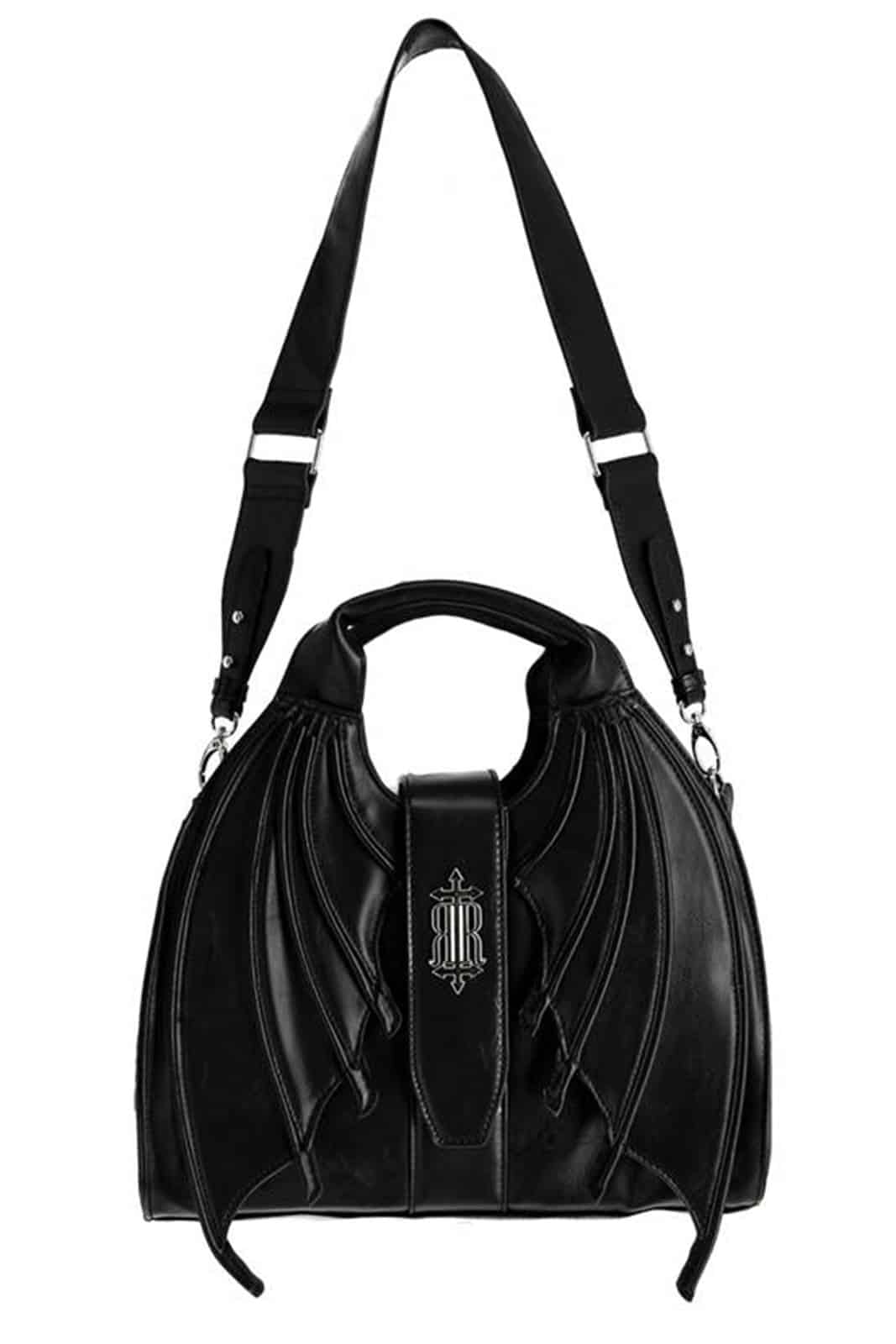 Auffällige Tasche in Fledermausform aus ökologischem Kunstleder. Ausgestattet mit Tragegriff als auch mit breitem Schulterriemen.