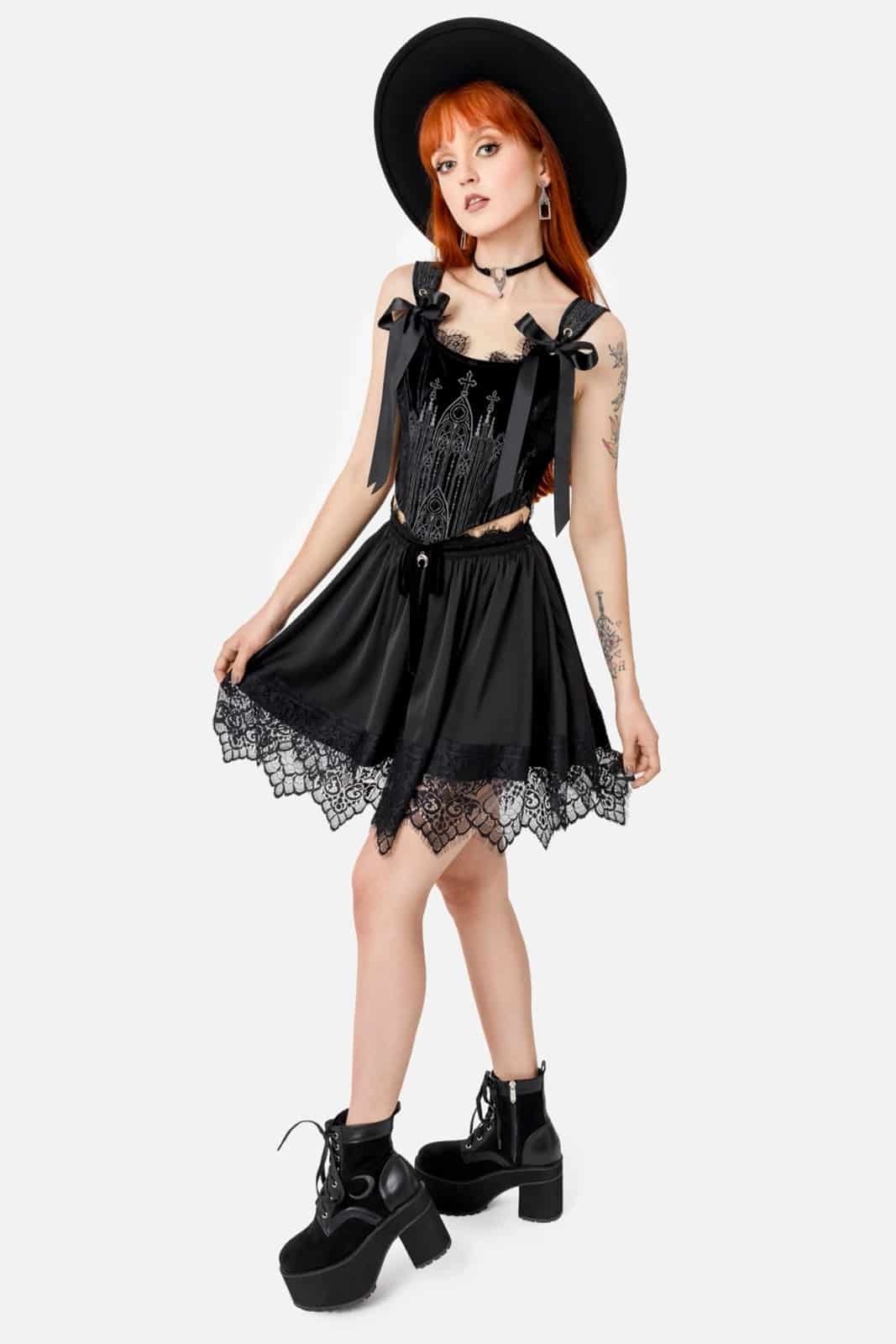Das Top ist auf der Vorderseite und auf den Schulterträgern mit einer Gothic-Kathedralen-Stickerei mit metallischem Rotgussfaden verziert. Der Körper ist aus schwarzem, luxuriösem Samt mit metallischen Akzenten gefertigt. Die taillierte und verstärkte Struktur formt Deine Figur und stützt perfekt.