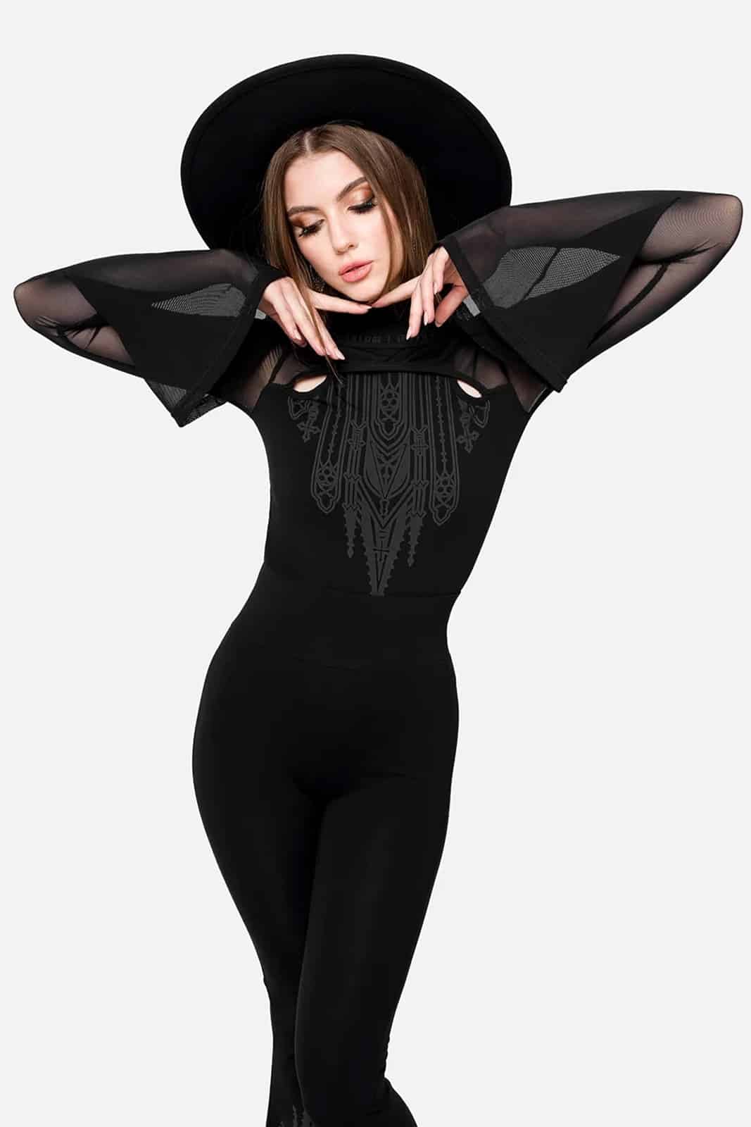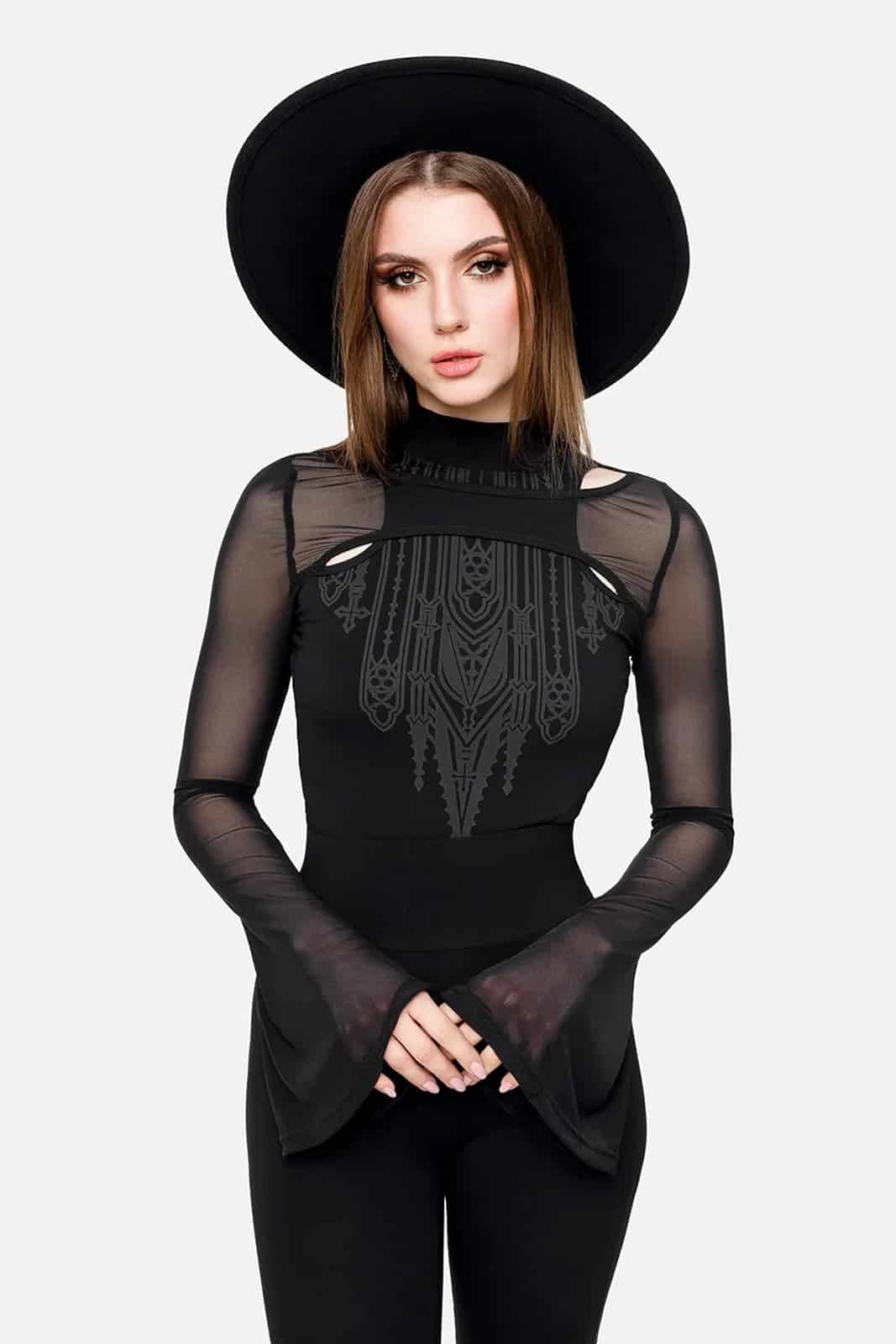 Dieses Gothic-Samt-Crop-Top vereint dunkle Romantik mit eleganter Dramatik. Gefertigt aus weichem Stretchsamt, besticht es durch transparente Mesh-Einsätze und weit ausgestellte Ärmel. Das geraffte Brustteil verleiht einen Hauch von Vintage-Charme, während der kurze Schnitt perfekt zu hoch geschnittenen Röcken oder Hosen passt. Ideal für mystische, romantische und alternative Outfits.