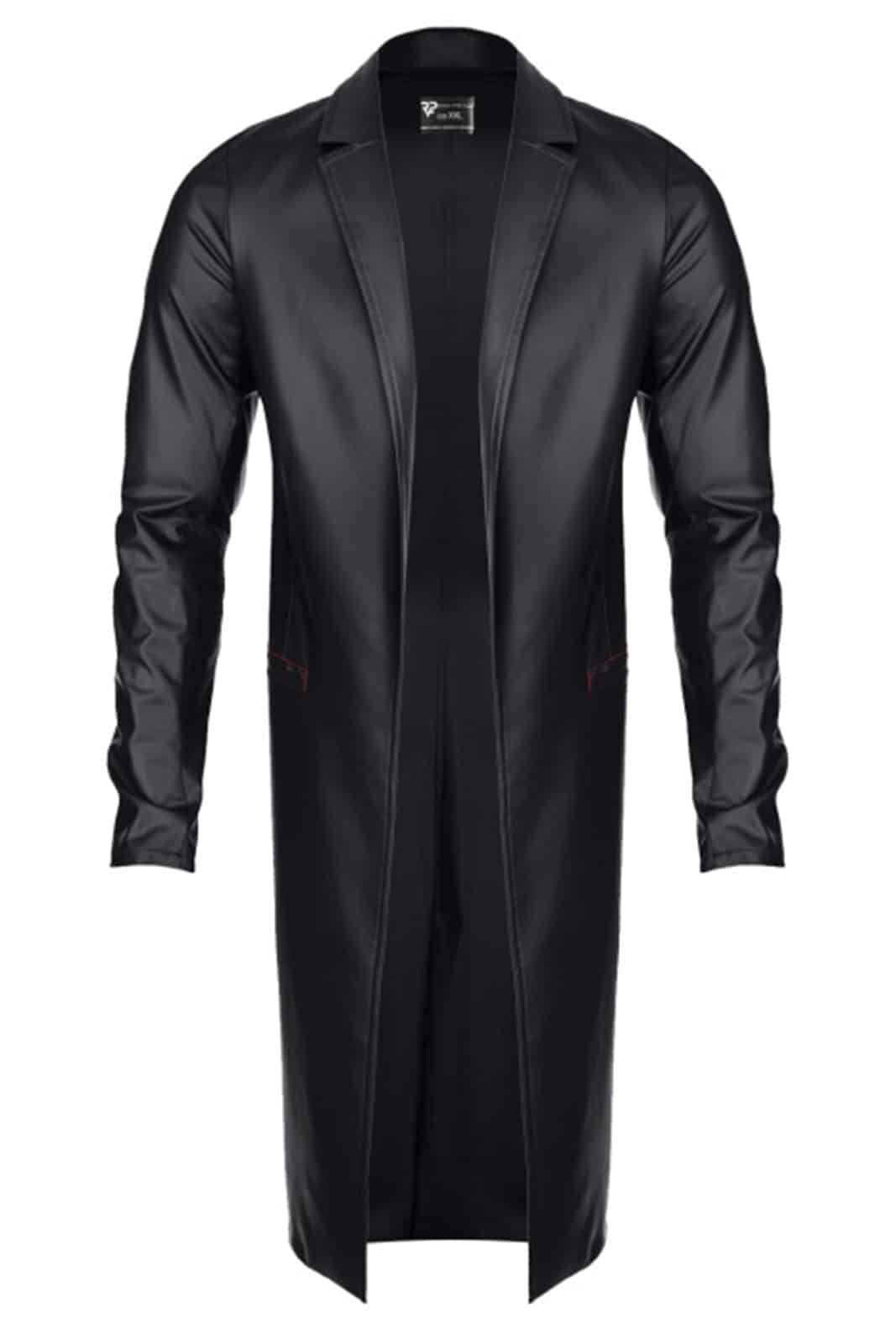 Made from high-quality black wetlook material. A slightly narrow waistline and a widened bust and back line give the silhouette a more massive and slightly intimidating look. They visually enlarge the bust and back while making the waist look slimmer. The classic shape of the coat is emphasized by long lapels and collars.