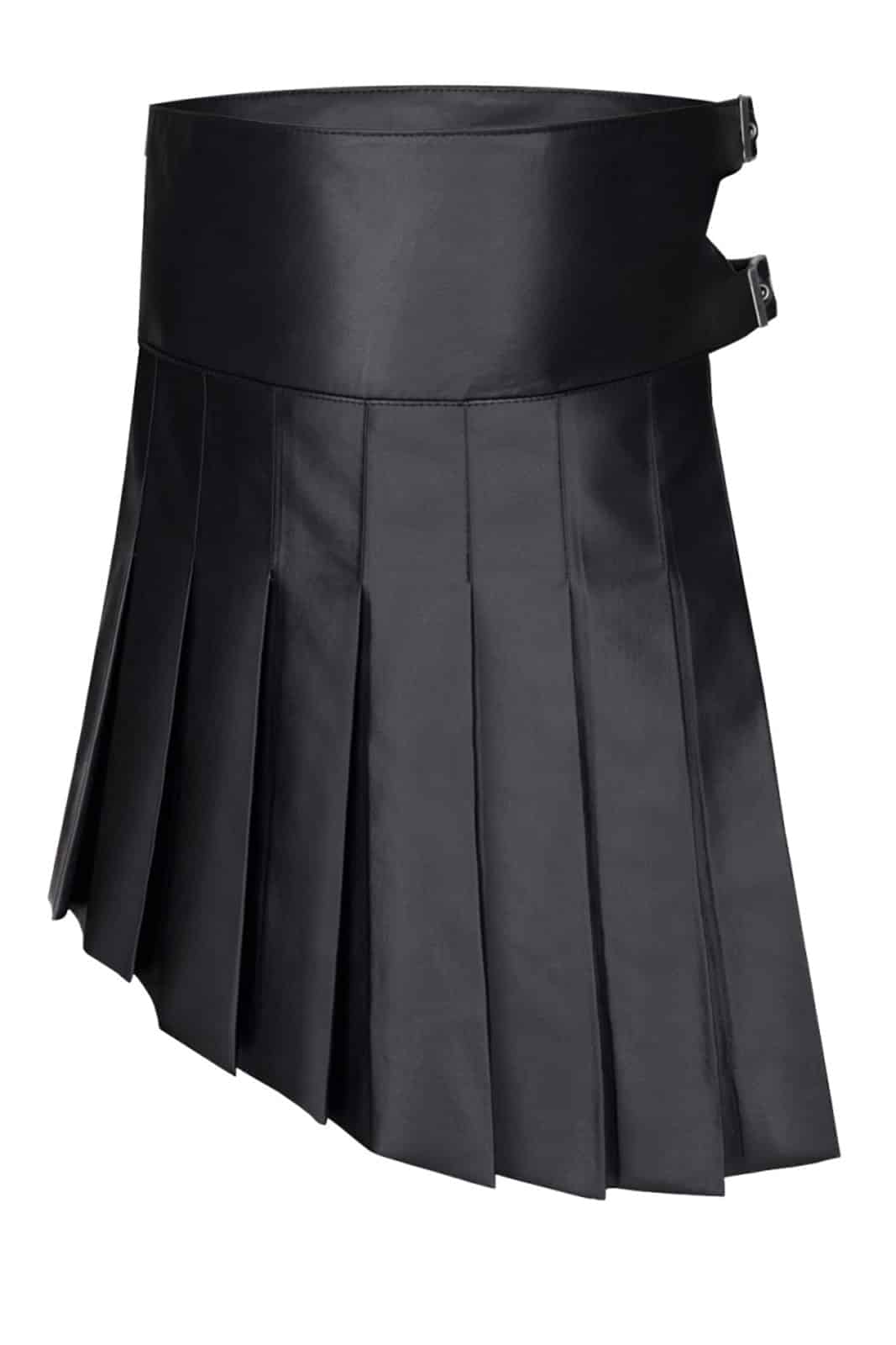 Spektakulärer und einzigartiger Rock im „Gladiator“-Stil. Komplett aus hochwertigem schwarzem Wetlook-Stoff gefertigt. Ein breiter Gürtel oben sorgt dafür, dass es schön an der Taille und Hüfte sitzt. Auf der linken Seite befinden sich zwei Gürtel mit dekorativen und verstellbaren Halterungen. Es erleichtert das An- und Ausziehen des Rocks und verleiht der Silhouette eine bessere Passform. Was ins Auge fällt, sind die breiten vertikalen Falten, die oben und nicht unten zusammengenäht sind. Durch diese Lösung wirken die Hüften schlanker und attraktiver. Unten fällt der diagonale Schnitt auf, der ihm ein einzigartiges und originelles Aussehen verleiht.