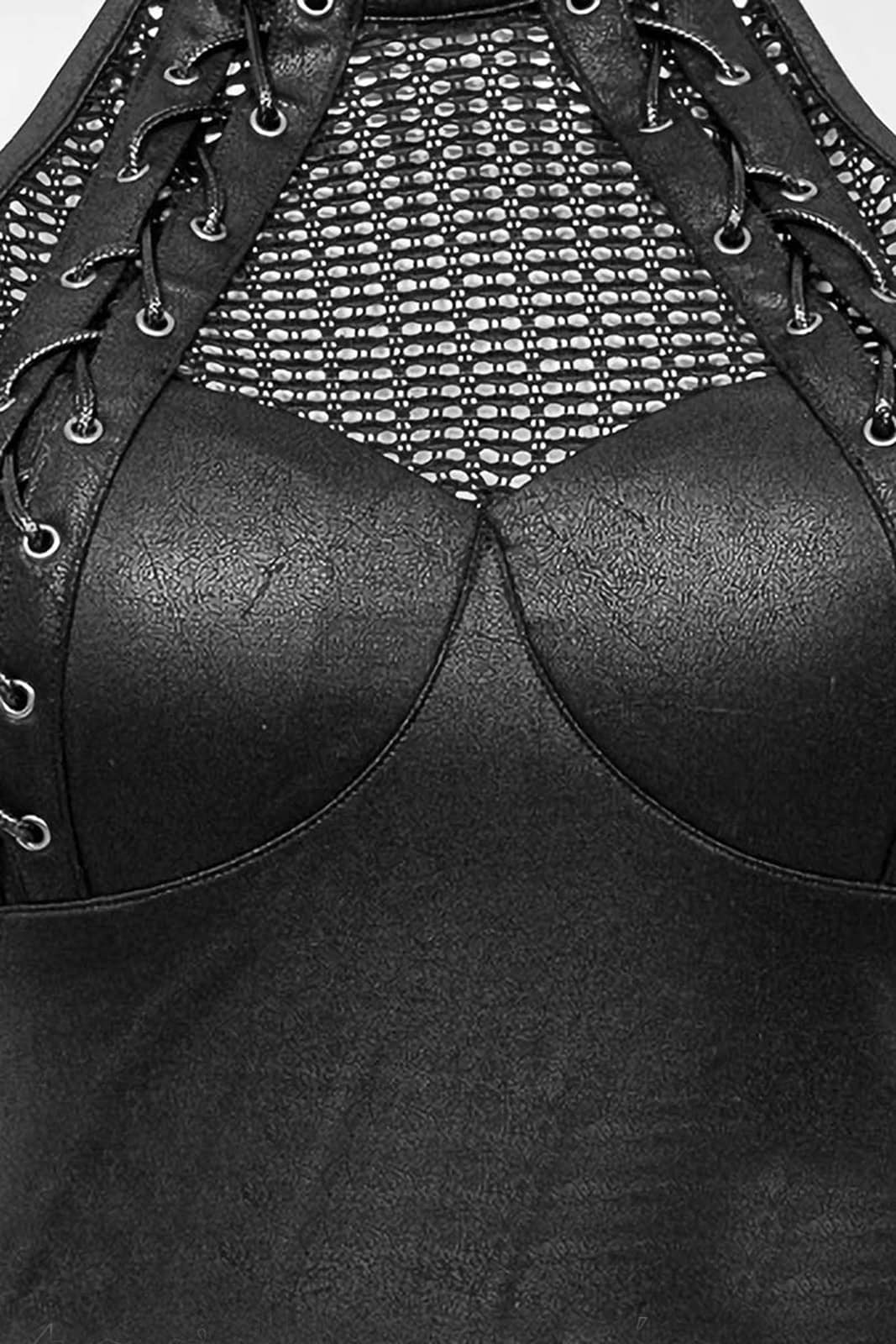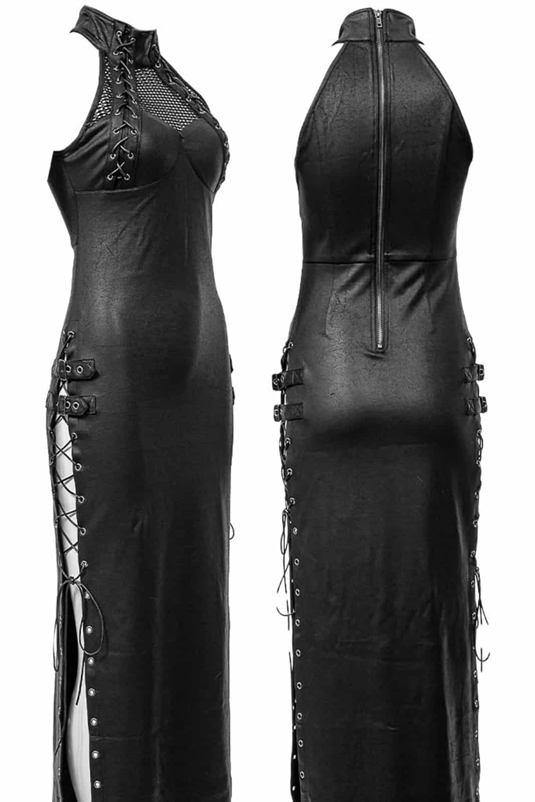 Dark seduction meets cyber accent in the DareDoll maxi dress – an expressive statement piece for the midnight hour. The figure-hugging maxi dress hugs the figure with its smooth leather-look fabric, while transparent mesh inserts draw the eye. Lace-up details on the bust add a touch of drama, framed by a sleeveless halterneck that draws everyone’s attention. Adjustable, detachable straps with O-rings offer versatile styling options, while high side slits run through the skirt with lace-up detailing and buckle straps for an extra touch of attitude. With a zipper closure at the back, this dress is sure to turn heads.