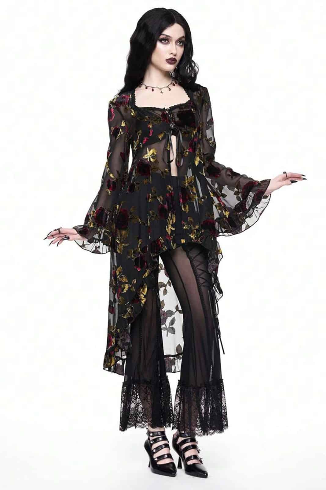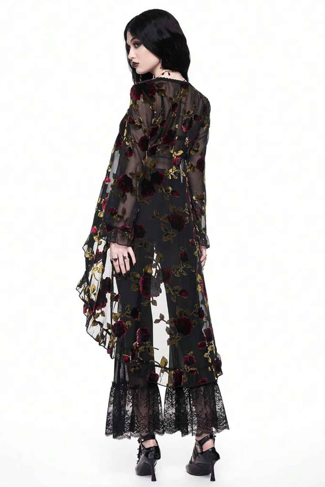 Transparente Gothic-Jacke aus feinmaschigem Netzmaterial mit herzförmigem Ausschnitt,filigranem Rüschensaum und austestellten langen Ärmeln. Das feine Mesh ist mit roten Rosen und goldenen Blättern überzogen.