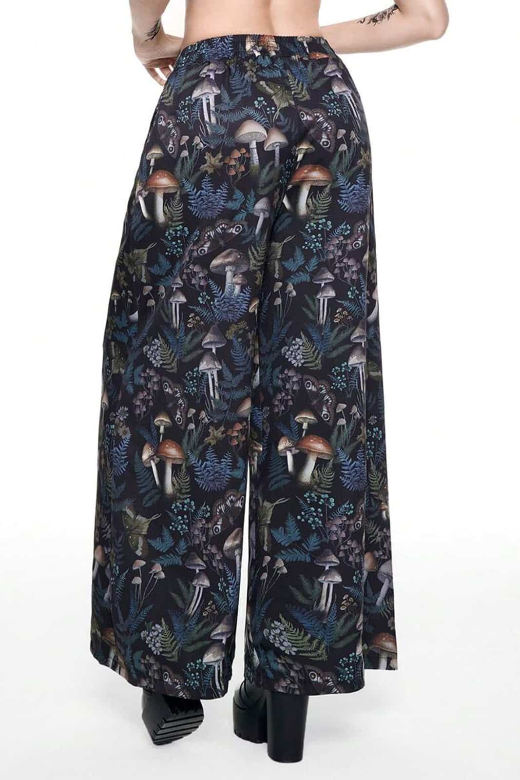 Wide-cut gothic trousers with an elastic waistband and tie belt. The trousers depict life in the forest in the form of mushrooms, butterflies, ferns and leaves.