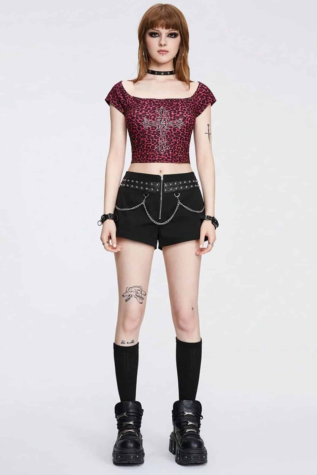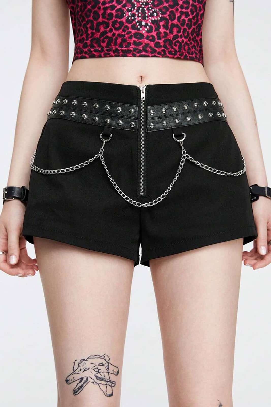 Diese tief sitzenden Shorts vereinen Gothic-Ästhetik mit Punk-Attitüde. Silberfarbene Nieten und abnehmbaren Ketten setzen markante Akzente und verleihen dem Design eine rebellische Note. Die figurbetonte Passform betont deine Silhouette, während die Metallelemente für einen auffälligen Look sorgen. Kombiniert mit Netzstrumpfhosen, Plateaustiefeln oder einem Crop Top entsteht ein ausdrucksstarkes Outfit für alle, die ihren Stil selbstbewusst präsentieren möchten.