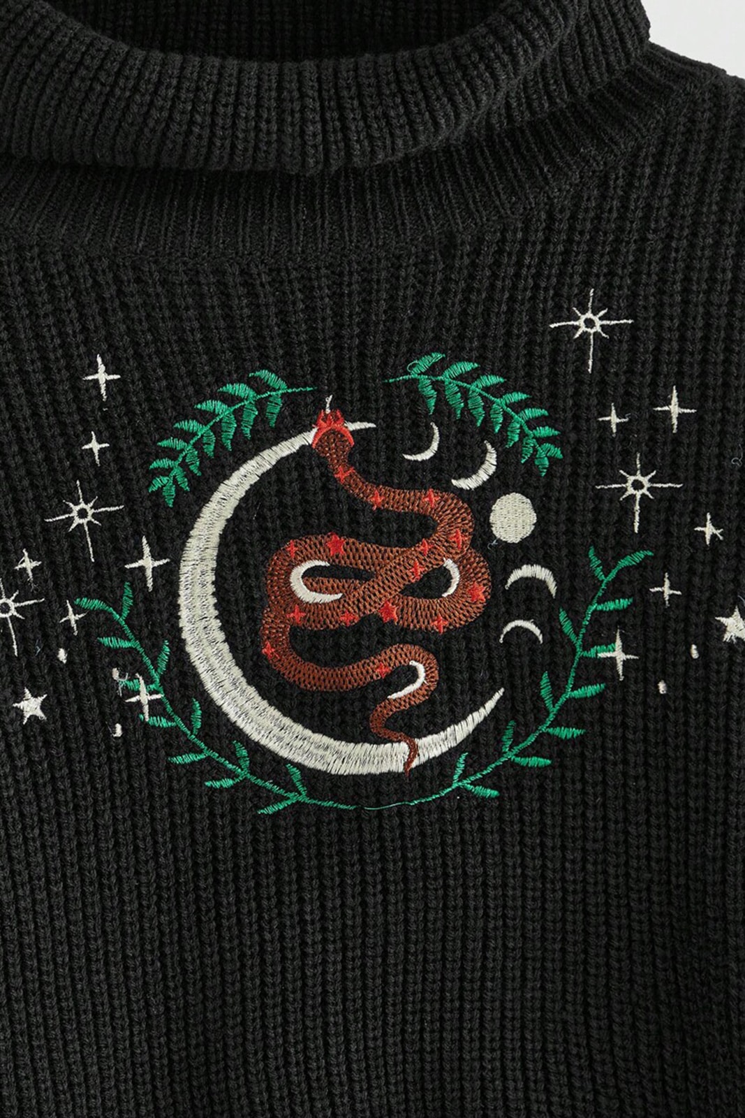 Knitted sweater with a high collar and beautiful embroidery on the chest and sleeves. The embroidery shows a snake on a crescent moon surrounded by twigs and stars.