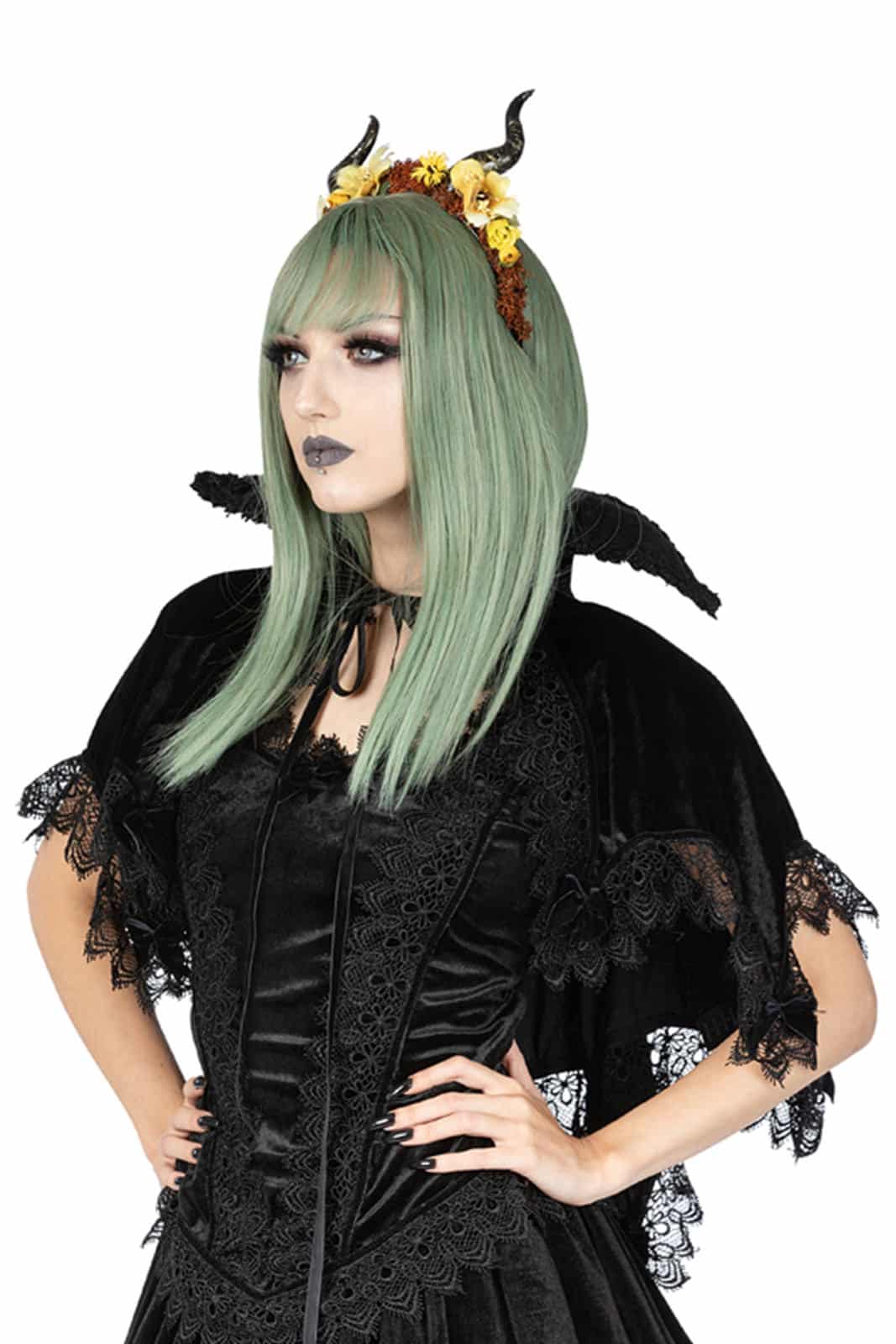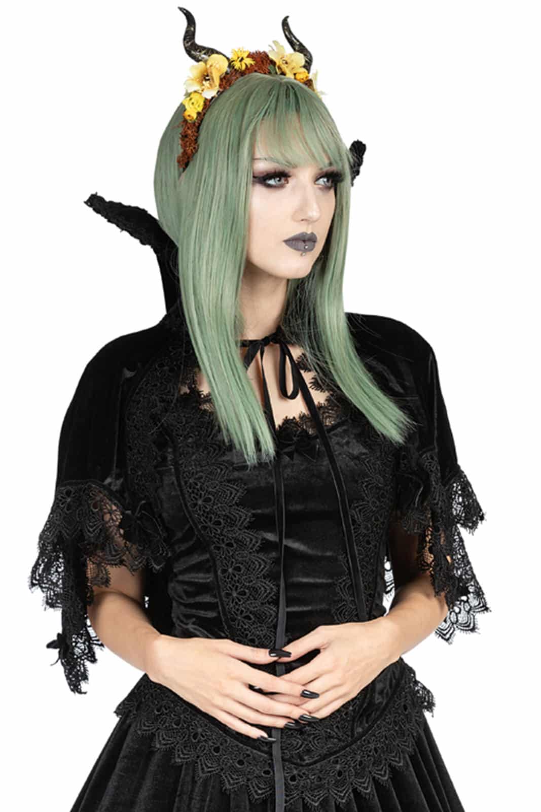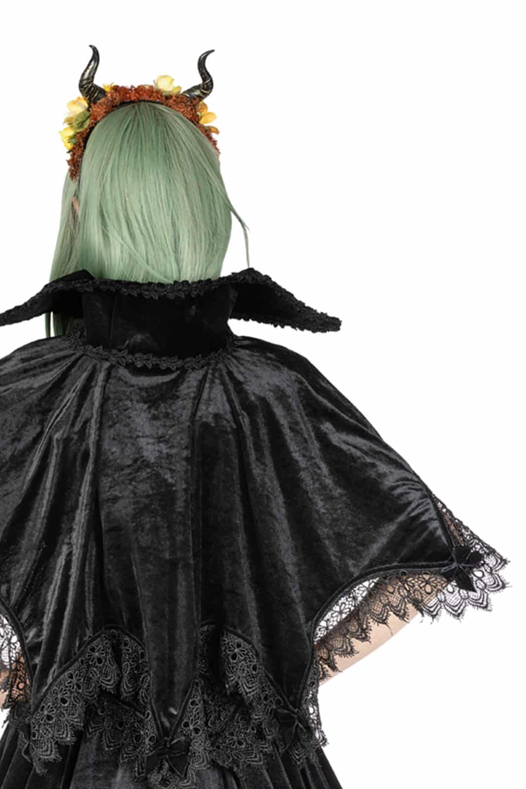 Samt-Umhang mit Vampir-Kragen, der sanft die Schultern bedeckt. Der untere Teil des Umhangs ist mit Spitzbögen geformt. Entlang des Saums der Bögen ist der Umhang mit venezianischer Spitze und schwarzem Samtband besetzt und jede Spitze ist mit einer großen Samtschleife verziert. Der steife Vampirkragen besteht aus zwei Lagen Samt, um sowohl die Innenseite des Kragens als auch die Außenseite zu bedecken, und ist auf beiden Seiten mit venezianischer Spitze besetzt. Verschluss mit Samtriemen vorne.
