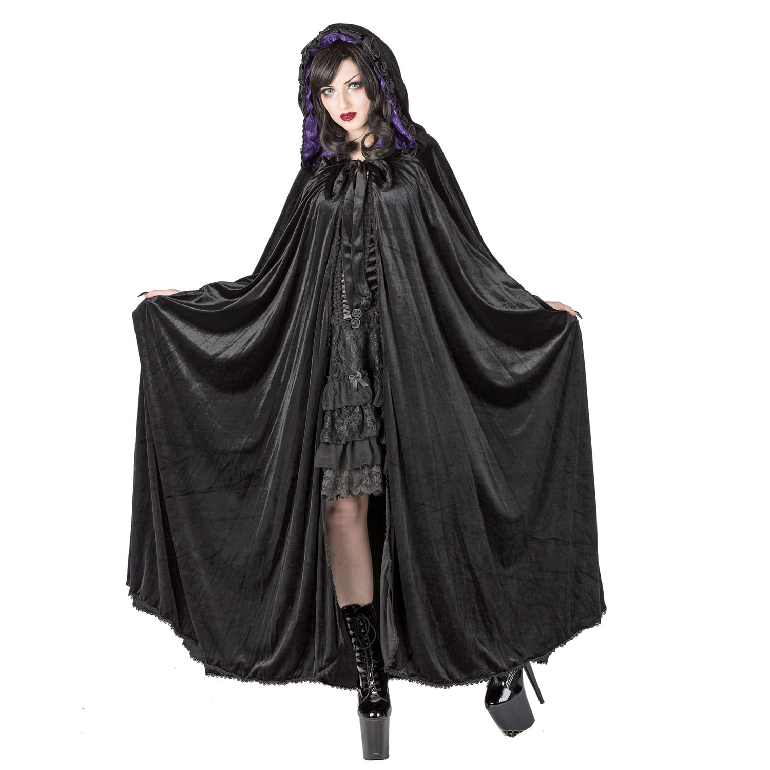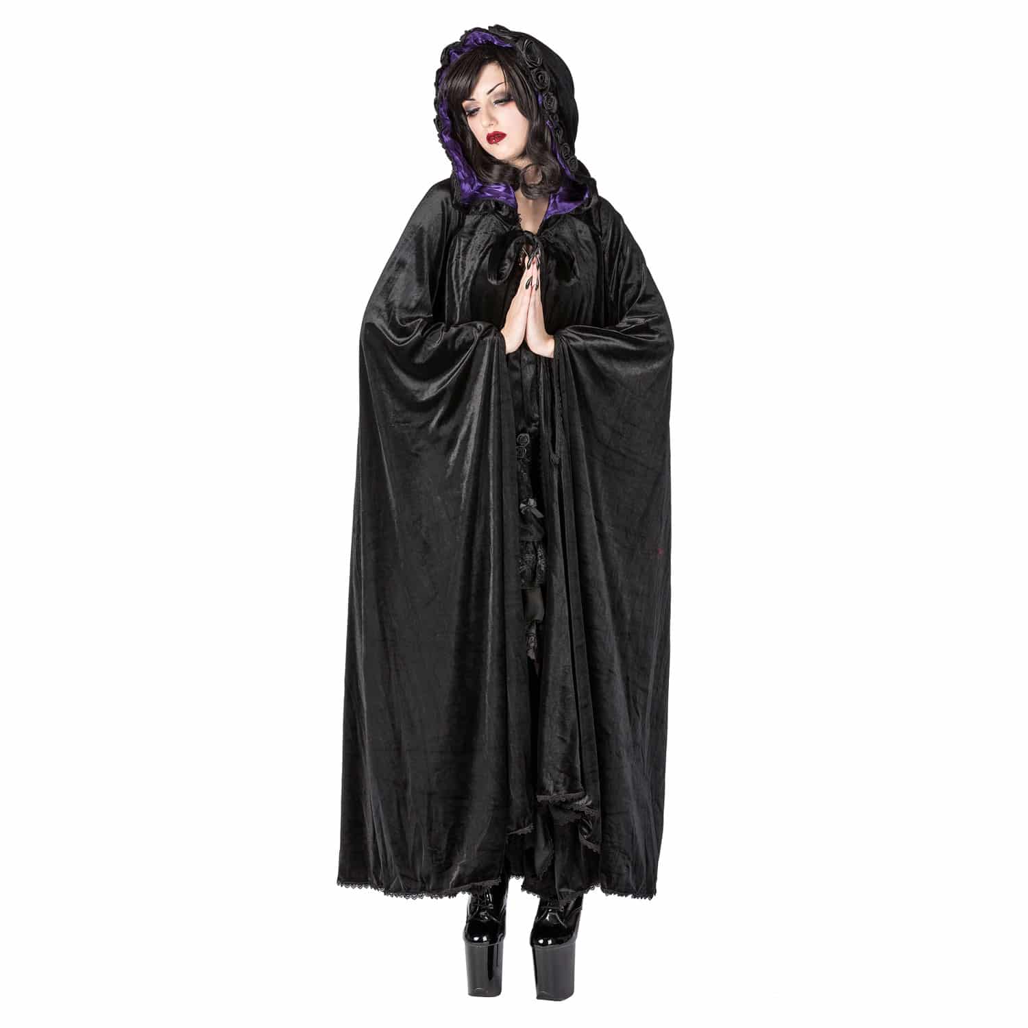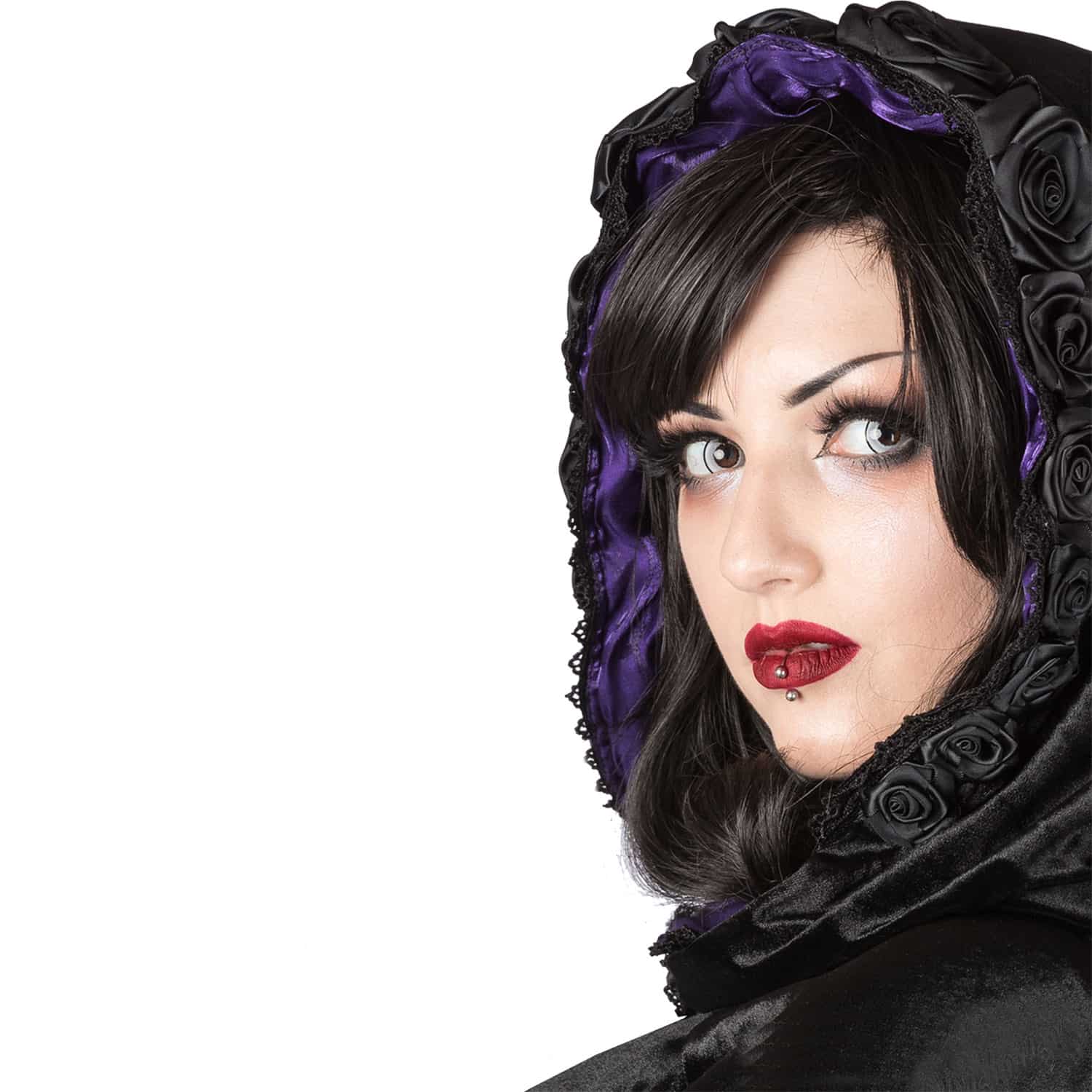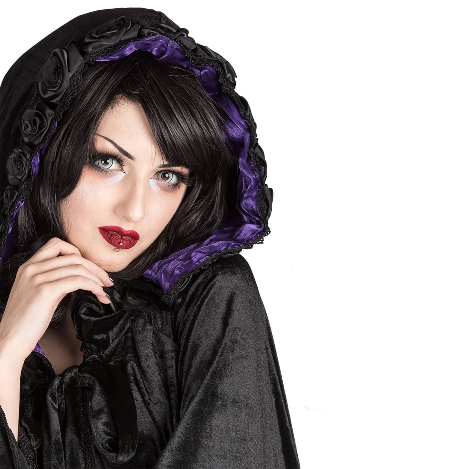 Weiter Samtumhang mit rosenbesetzter Kapuze. Weit schwingend geschnitten, mit dezenter, schwarzer Spitze verziert. Kapuze mit Organza gefüttert. Vampiristisch, gotisch und geheimnisvoll.