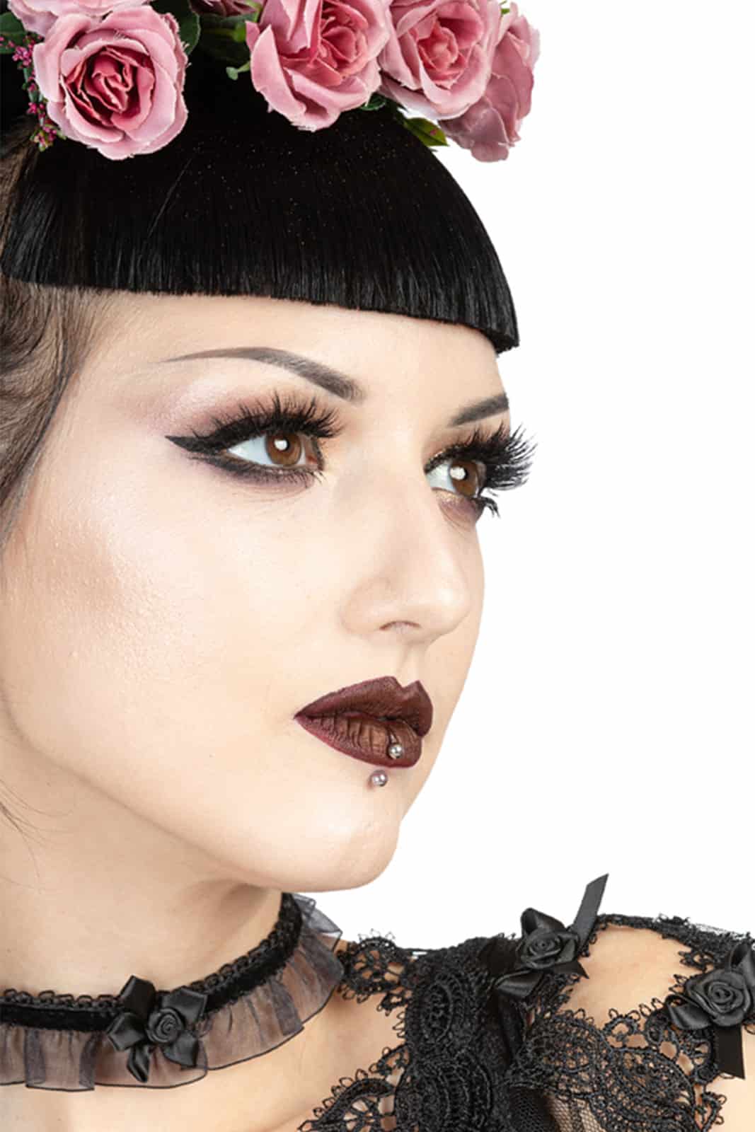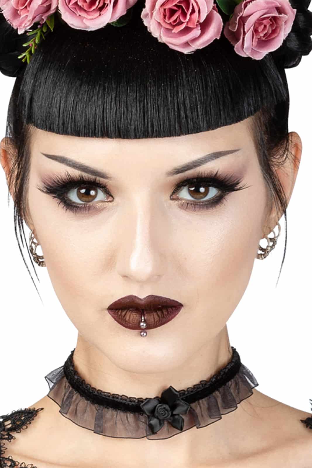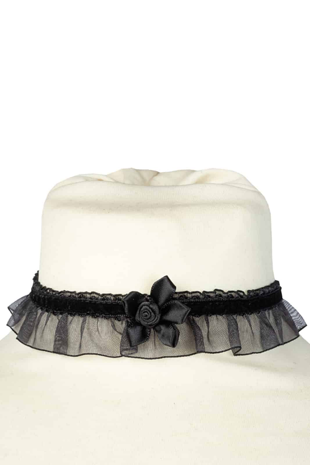 Zartes Halsband aus schwarzem Organza mit Rüschen und schwarzen Samtbandbesätzen. Verziert mit einer schwarzen Satinrose vorne in der Mitte. Der Choker wird auf der Rückseite mit einem schwarzen Satinband für eine perfekte, verstellbare Passform gebunden.