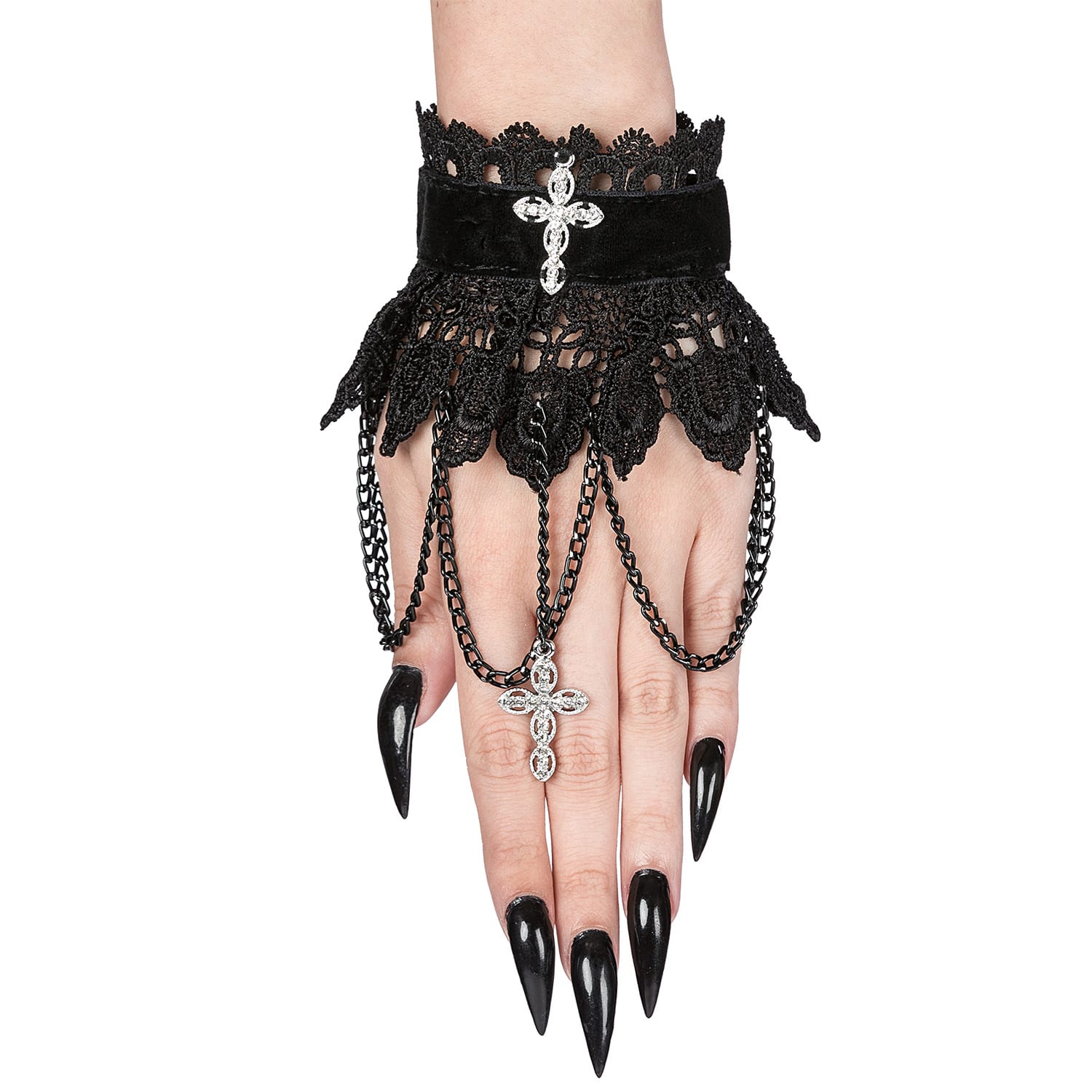 Aufwändig gestaltete Gothic Handstulpen aus feiner Spitze, verziert mit einem Samtband, schwarzen Ketten und zwei silberfarbenen Kreuzen, besetzt mit Schmucksteinen. Größe mit zwei Druckknöpfen anpassbar.