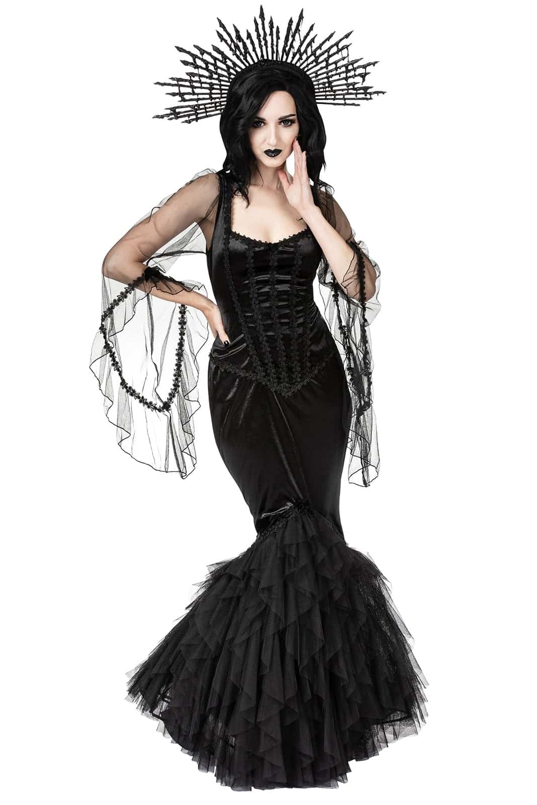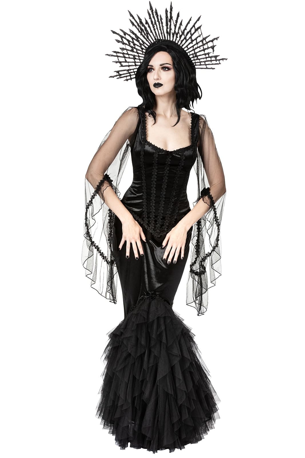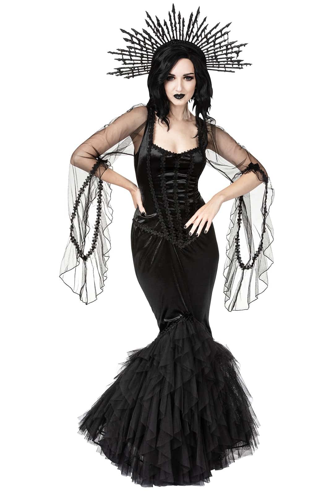 Dieses dramatische, figurbetonte Gothic-Maxikleid aus schwarzem Samt vereint dunkle Eleganz mit märchenhafter Opulenz. Der eckige Ausschnitt und die ikonischen Morticia-Ärmel aus transparentem Mesh verleihen dem Look eine geheimnisvolle, fast übernatürliche Ausstrahlung. Florale Spitzenapplikationen am Oberteil formen eine schmeichelnde Silhouette, während der hüftbetonte Rock in eine üppige Meerjungfrauenform aus Mesh und Tüll übergeht und bei jeder Bewegung eindrucksvoll fließt.