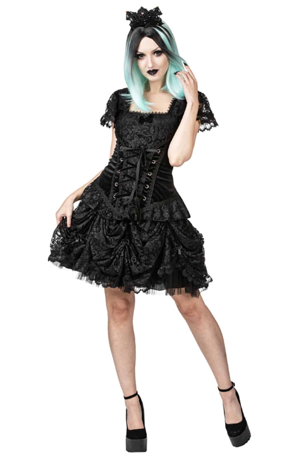Multi-layered mini skirt made of black lace with a flexible elastic waistband and zipper at the side. The top lace layer is gathered over the entire skirt with black satin bows, creating a full, dramatic draped effect. The silky soft underskirt is adorned with a wide layer of soft, ruffled tulle for added volume.