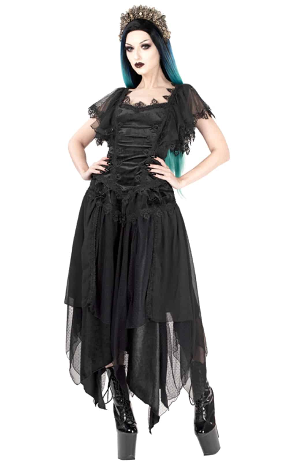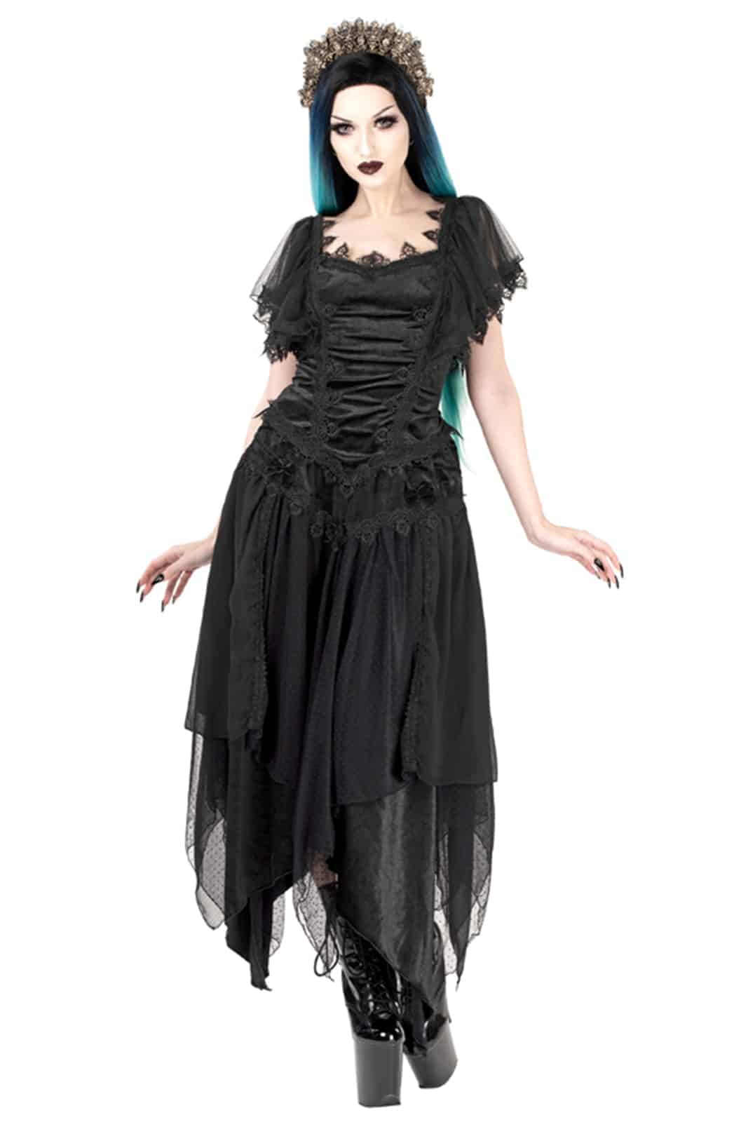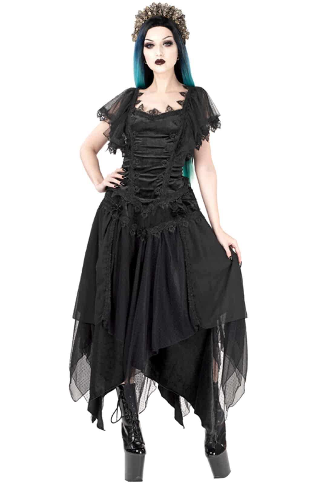 Pixie-Rock aus schwarzem Samt mit einer überkreuzten Applikation aus schwarzem Samtband an den Hüften, die mit großen Samtschleifen verziert ist. Die oberste Schicht des Rocks besteht aus mehreren Bahnen aus pixieförmigem, schwarz gepunktetem, weichem Mesh und marmoriertem Chiffon. Als Trennung zwischen den Paneelen dient ein schwarzer, blattförmiger Venezianerbesatz. Elastischer Bund und verdeckter Reißverschluss auf der Rückseite des Rocks.