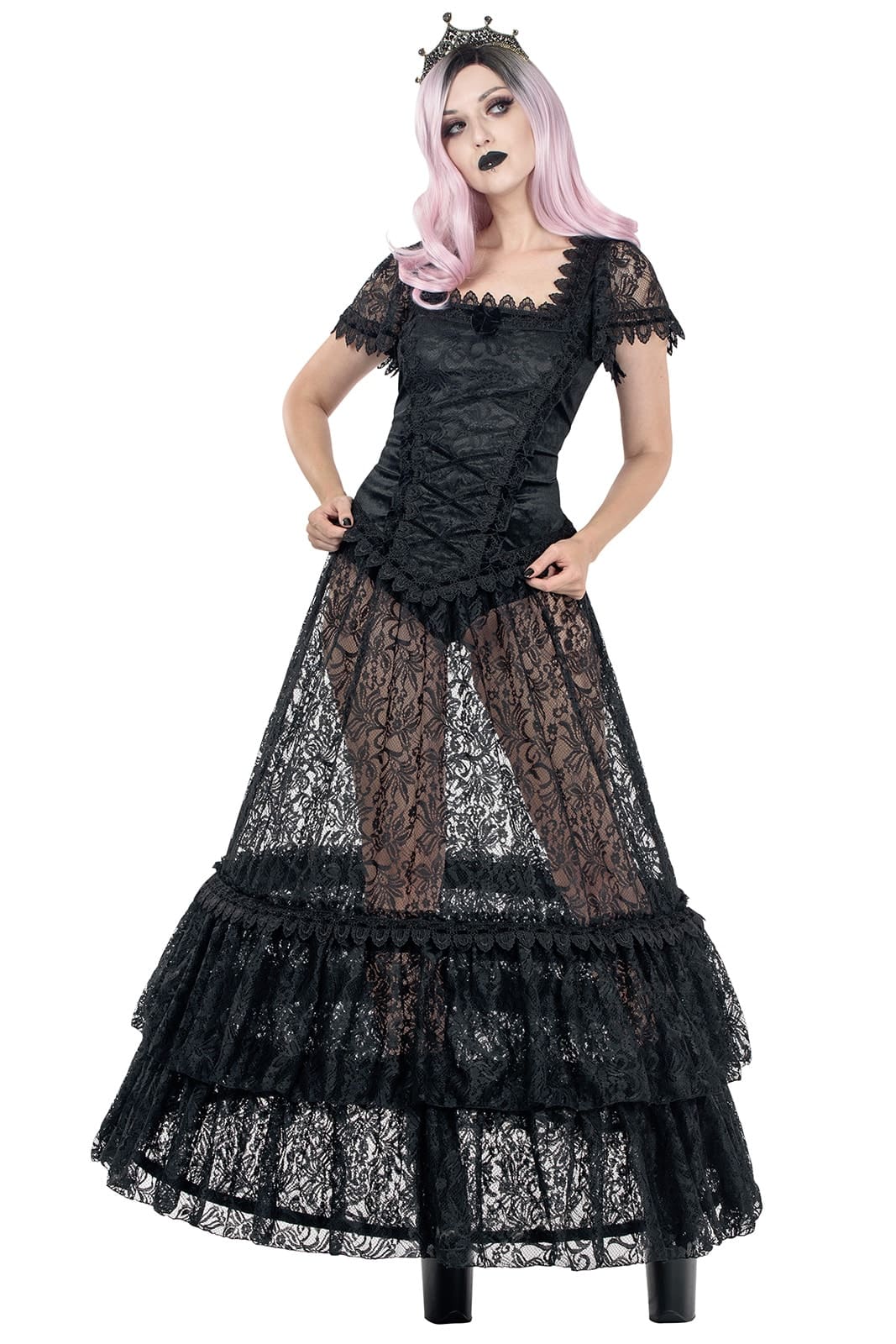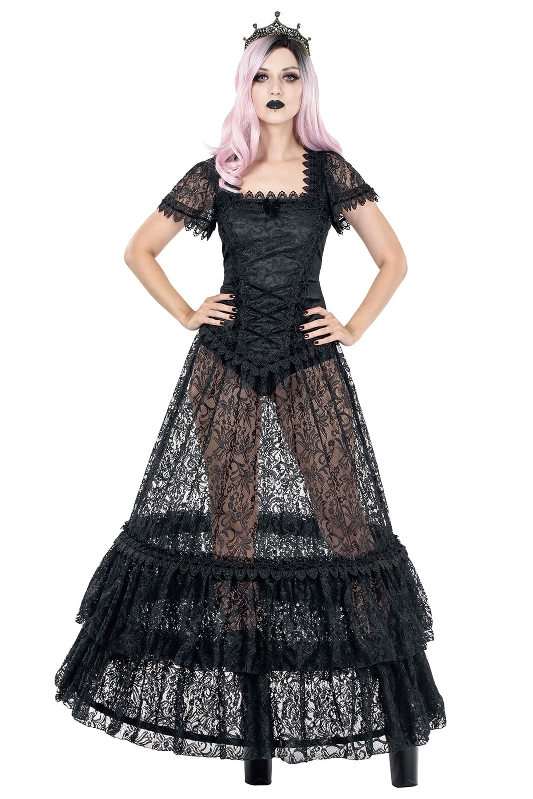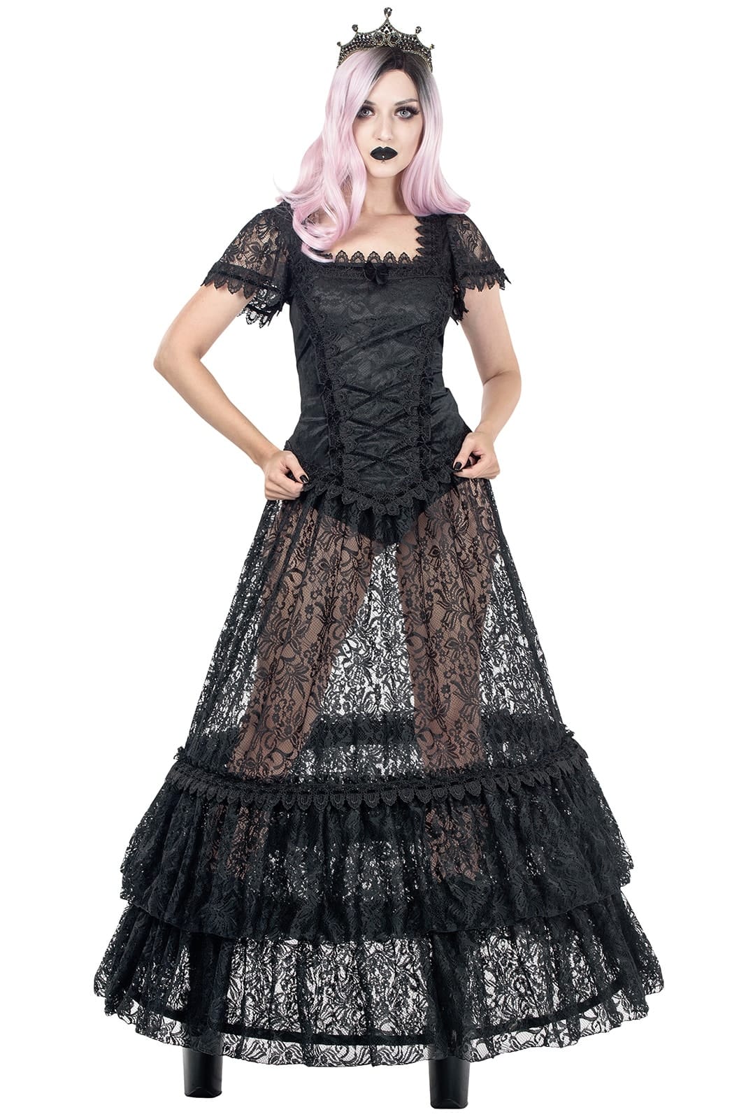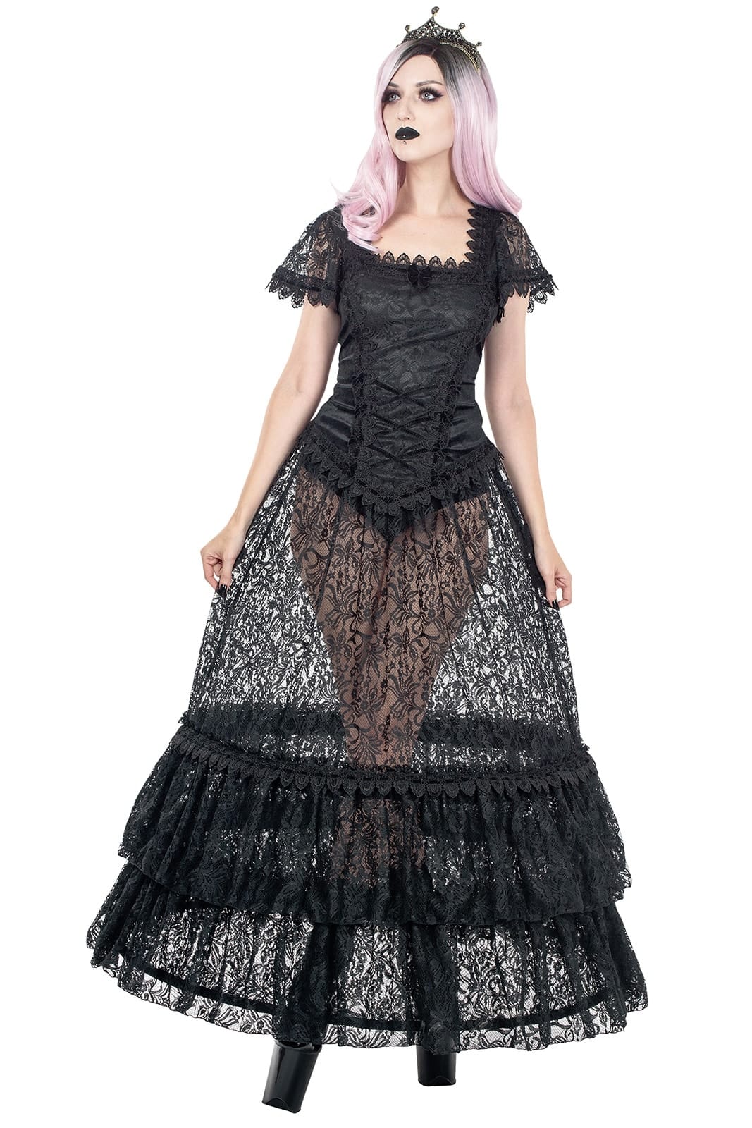 Black crinoline made of Sicilian lace, elastic waistband for a perfect fit and concealed zipper at the side. The crinoline has three steel ring stays for a strong spreading effect. The lower part of the skirt is decorated with two wide, ruched tiers made of Sicilian lace. Each tier is decorated with black velvet ribbon lacing through brocade lace trim. Ideal for adding width and volume to skirts and dresses.