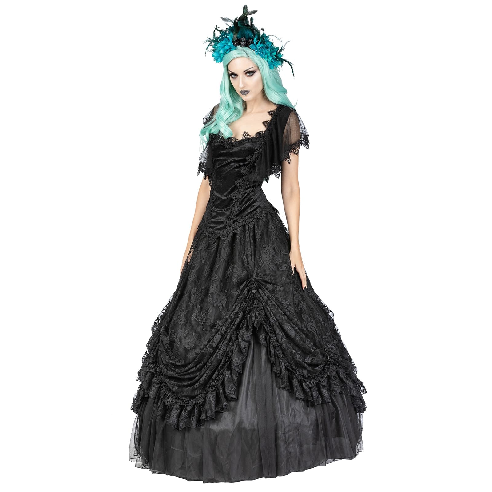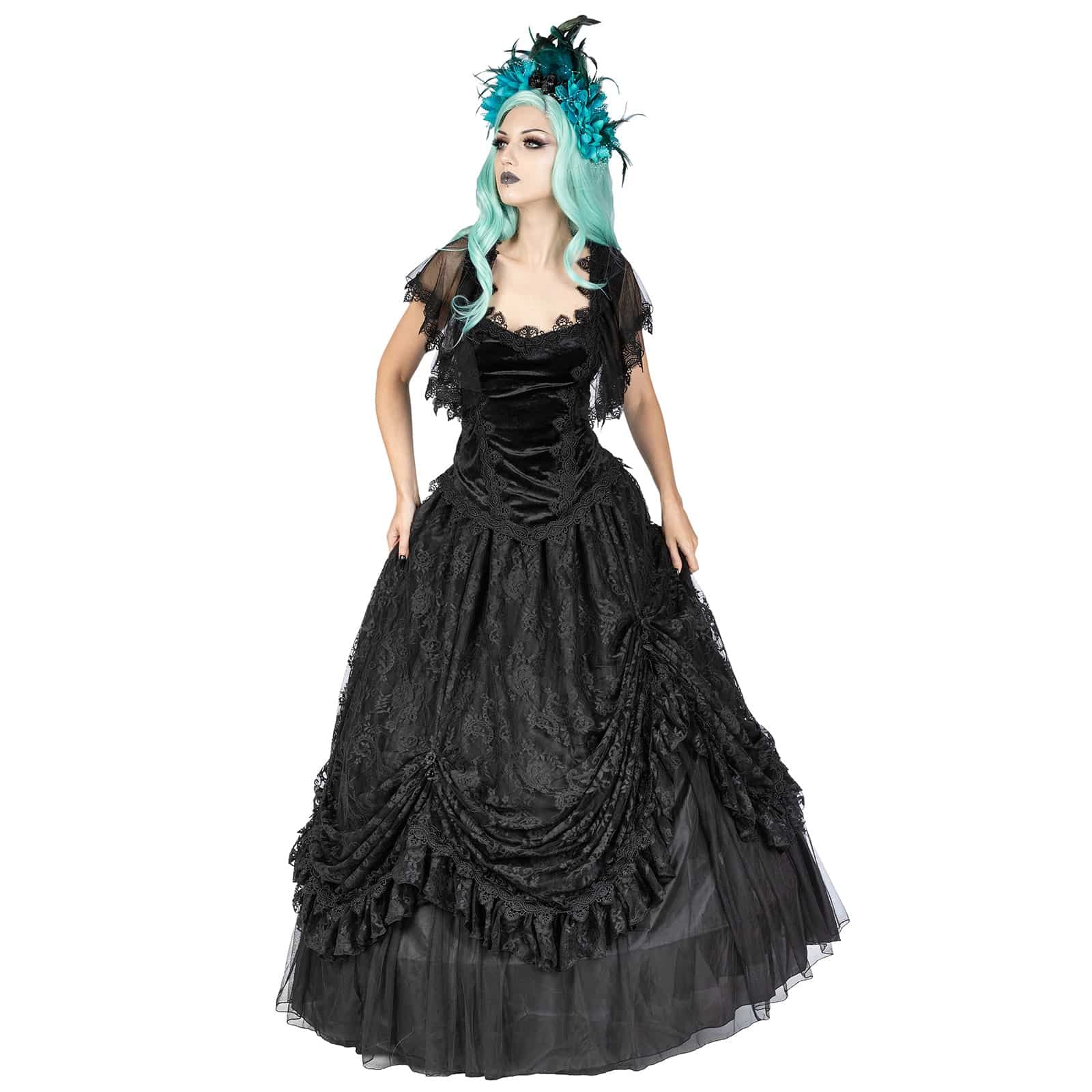 Mittelalterrock aus Vollsatin, Tüll und französischer Spitze. Der Satin-Innenrock ist bis zum Rocksaum mit einer gerüschten, fließenden Rüsche aus weichem Tüll verziert. Die breite, fließende Oberschicht des Rocks aus französischer Spitze wird von kleinen schwarzen Blumen gerafft. Entlang des gesamten Saums des Spitzenüberrocks ist eine breite Lage gerüschter französischer Spitze mit schwarzer venezianischer Spitze besetzt. Der Rock hat einen elastischen Bund und einen Reißverschluss an der Seite.