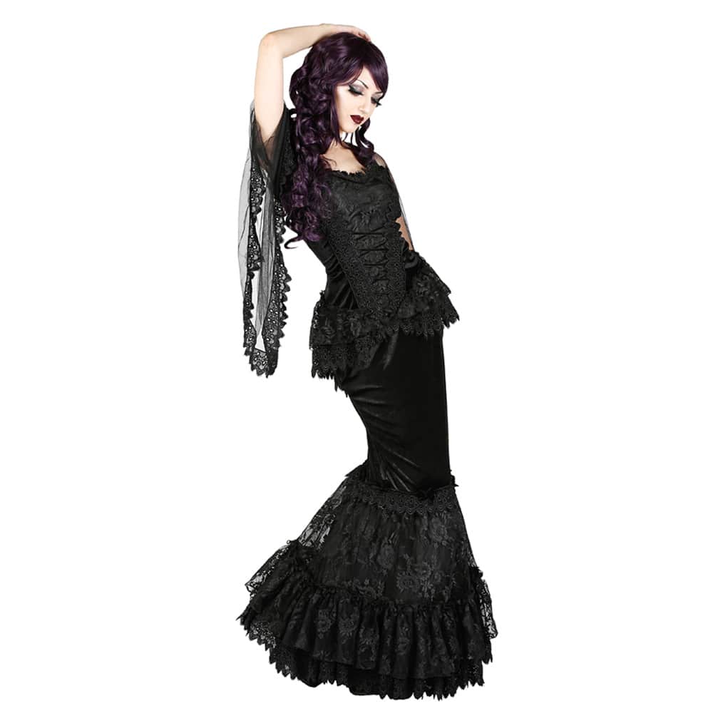 Figurbetonter Gothic Fishtail-Rock aus schwarzem Stretchsamt, opulent mit sizilianischer Spitze verziert. Voluminöses, zweilagiges Rockteil aus Tüll und wunderschöner Spitze.