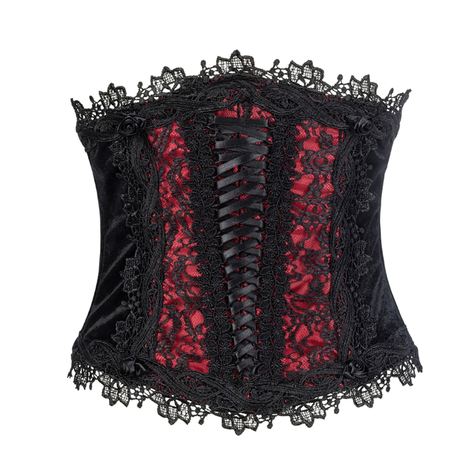 Gothic-Unterbrust mit Satinbandschnürung durch Metallösen. Die taillenbetonte Wespentaille besteht aus Satineinsätzen vorne und hinten mit sizilianischer Spitzenauflage, die beidseitig mit Brokatspitzenbesatz besetzt ist. In der hinteren Mitte ist der dreieckige Einsatz mit einer edlen Satinbandschnürung durch Schlaufenbesatz verziert. Die vollständig gefütterte Unterbrust ist mit schwarzen Satinrosen verziert und mit flexiblen Kunststoffstäbchen versehen. Die Schnürung kann sowohl vorne als auch hinten getragen werden.