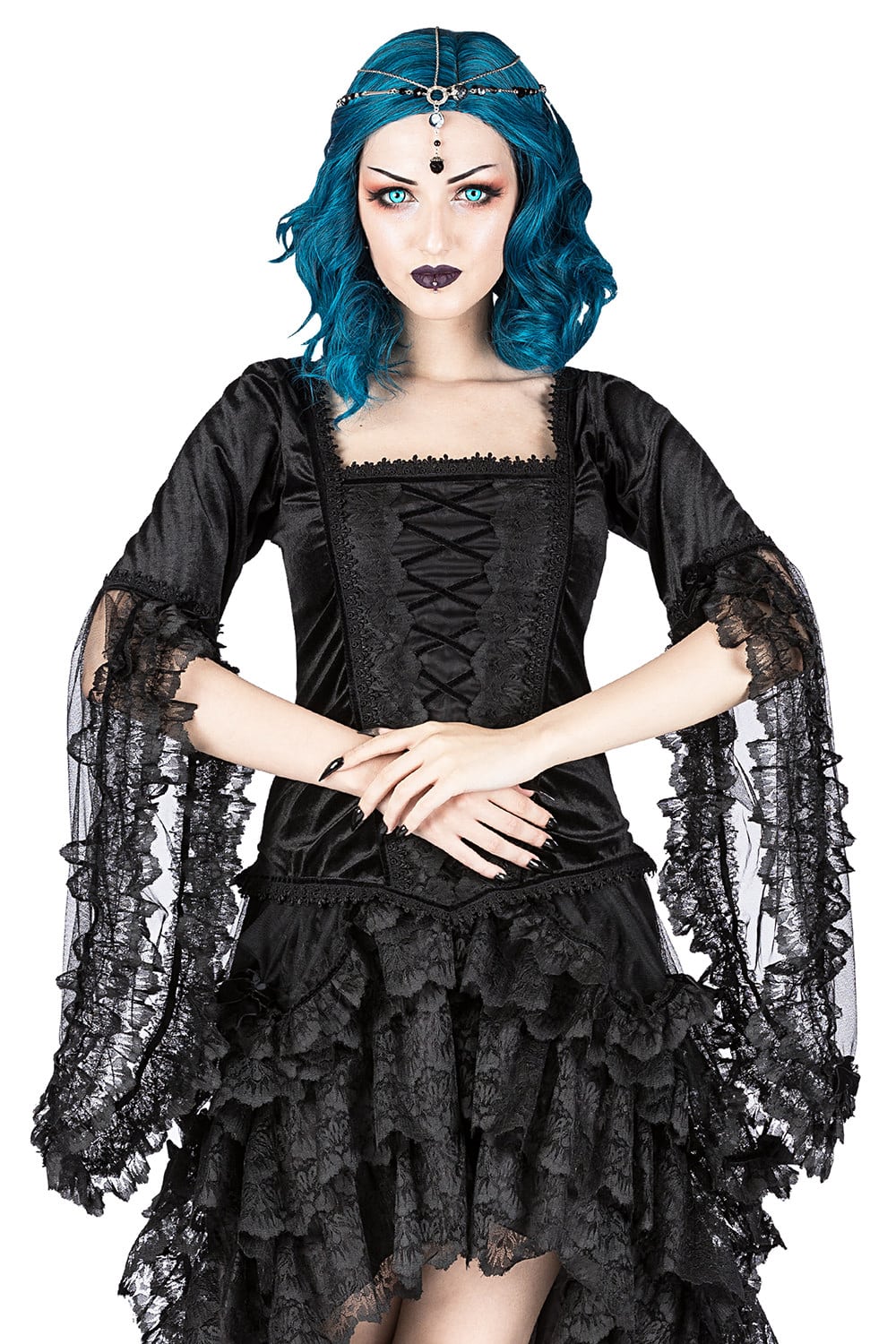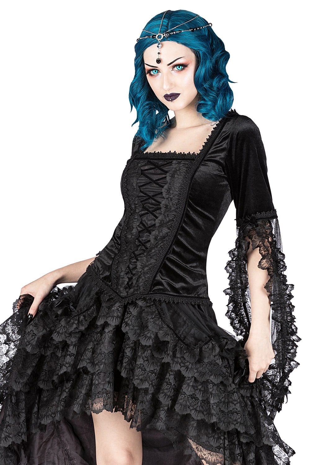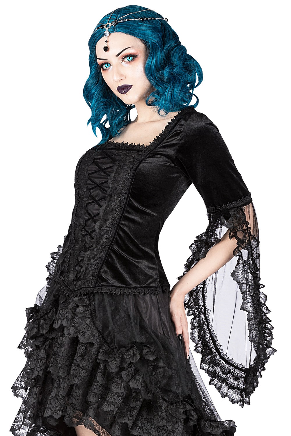 Gothic top made of velvet and satin with tulle overlay and beautiful sleeves made of soft, falling tulle. Decorated with velvet ribbons and noble borders. Equipped with a zipper in the back.