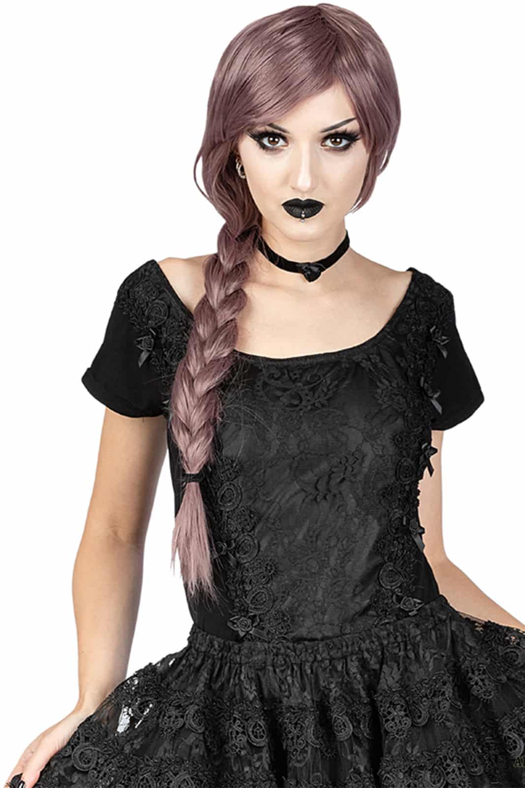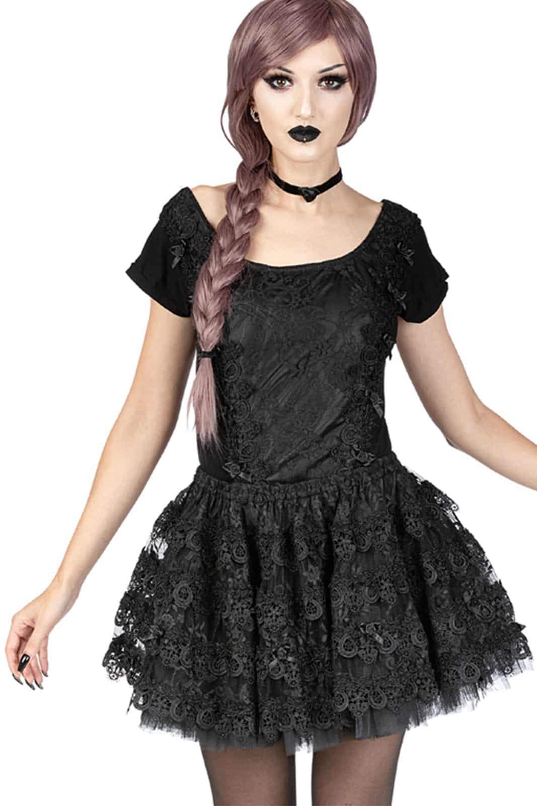 Black tank top made of elastic viscose with a scoop neckline. The top has a center front panel of soft satin with an overlay of French lace. On both sides the front is trimmed with scalloped Venetian lace and adorned with black satin bows and rosebuds.